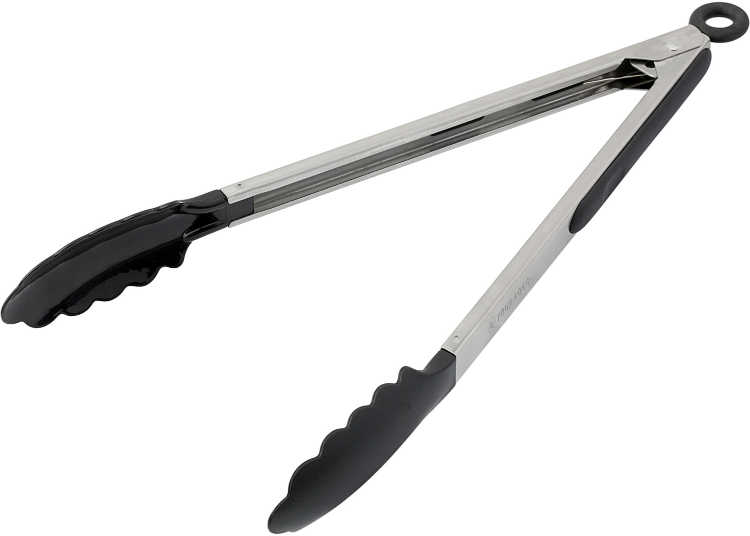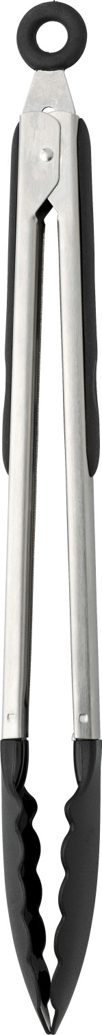 Grillzange aus Edelstahl, mit Applikationen aus Kunststoff und Aufhängeöse mit Feststeller. Die Grillzange ist spülmaschinengeeignet.