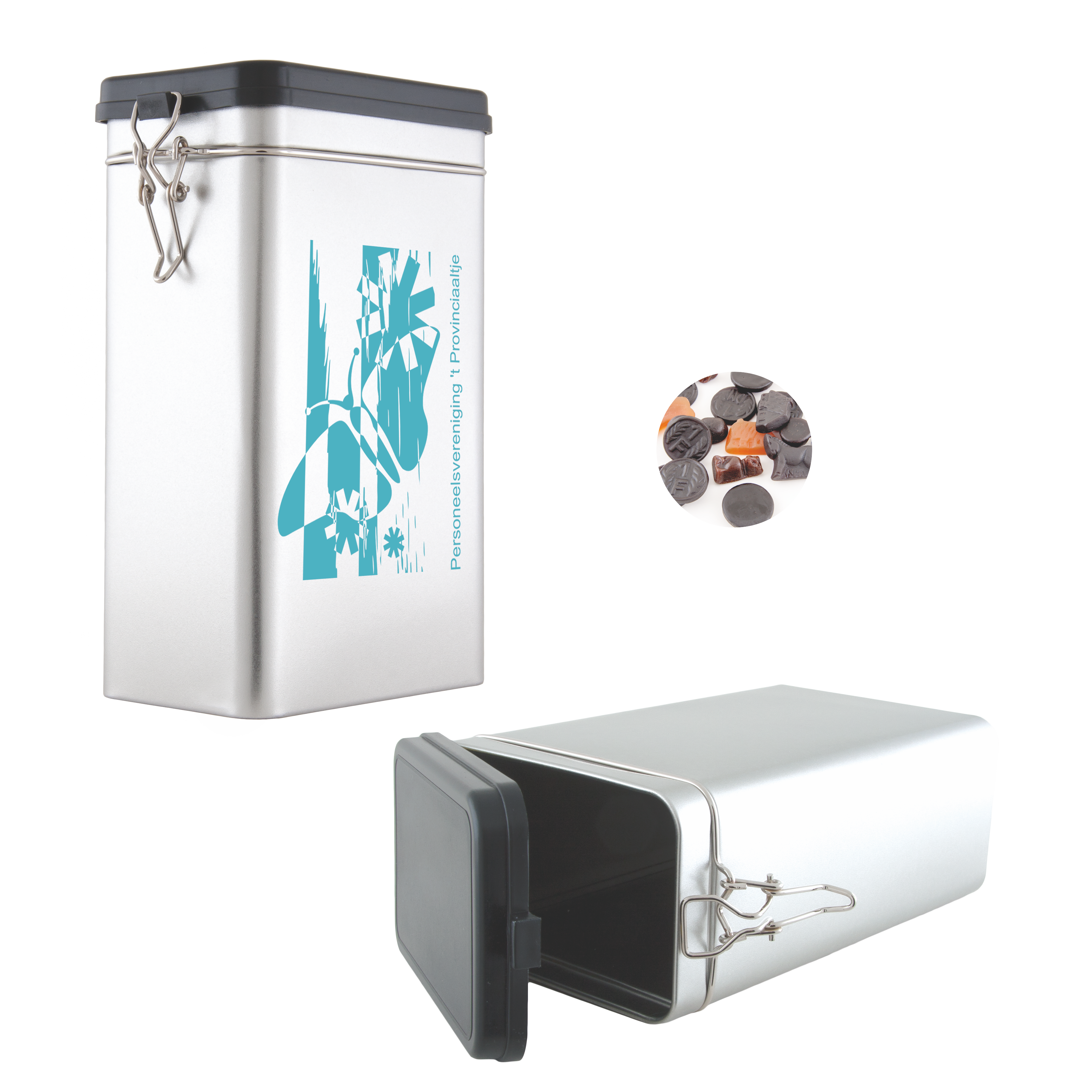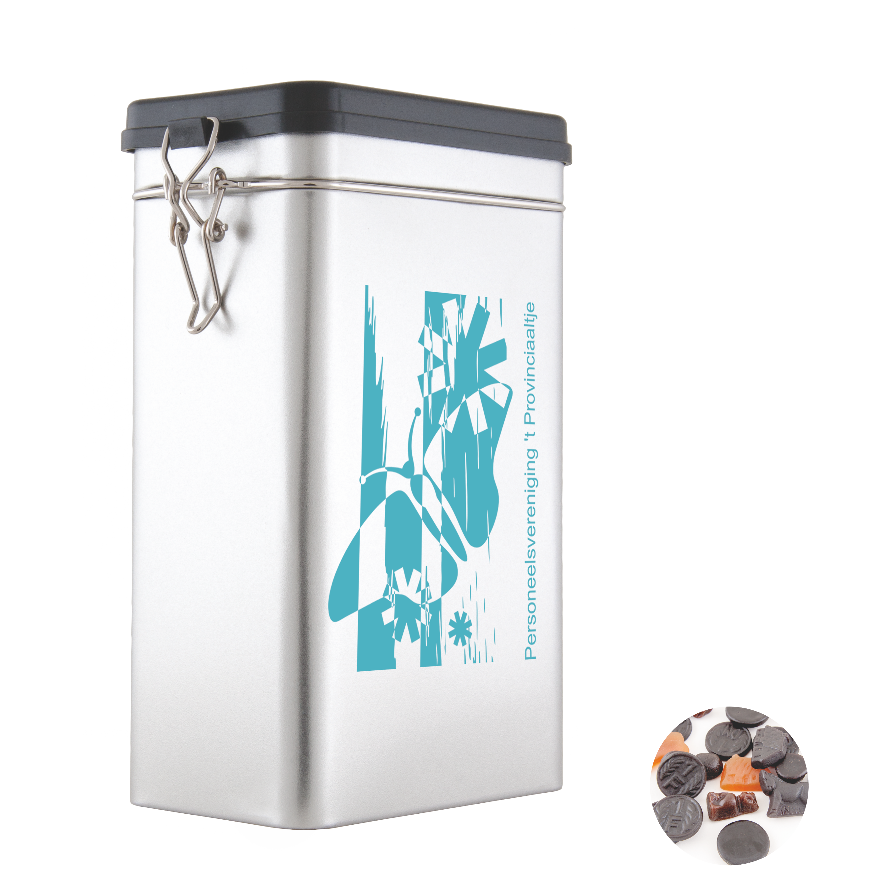 Große Blechdose silber 195 x 115 x 73 mm mit ca. 500 gr. gemischtem Lakritz.