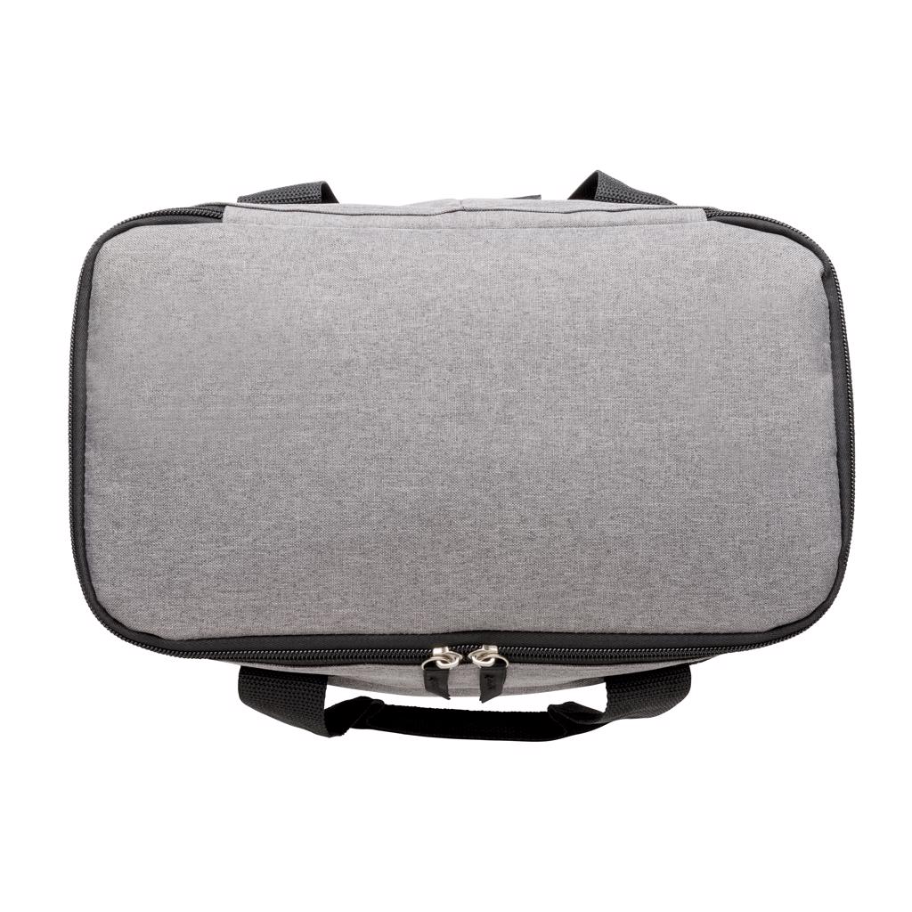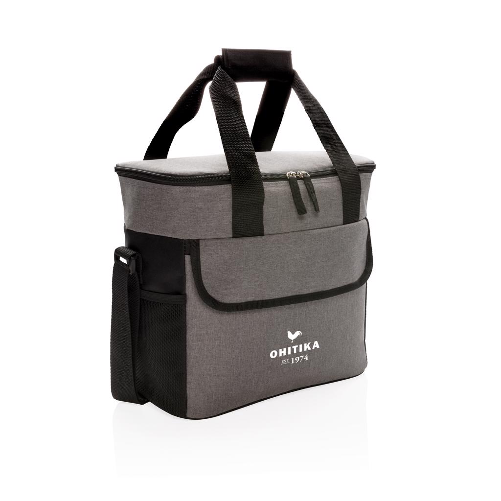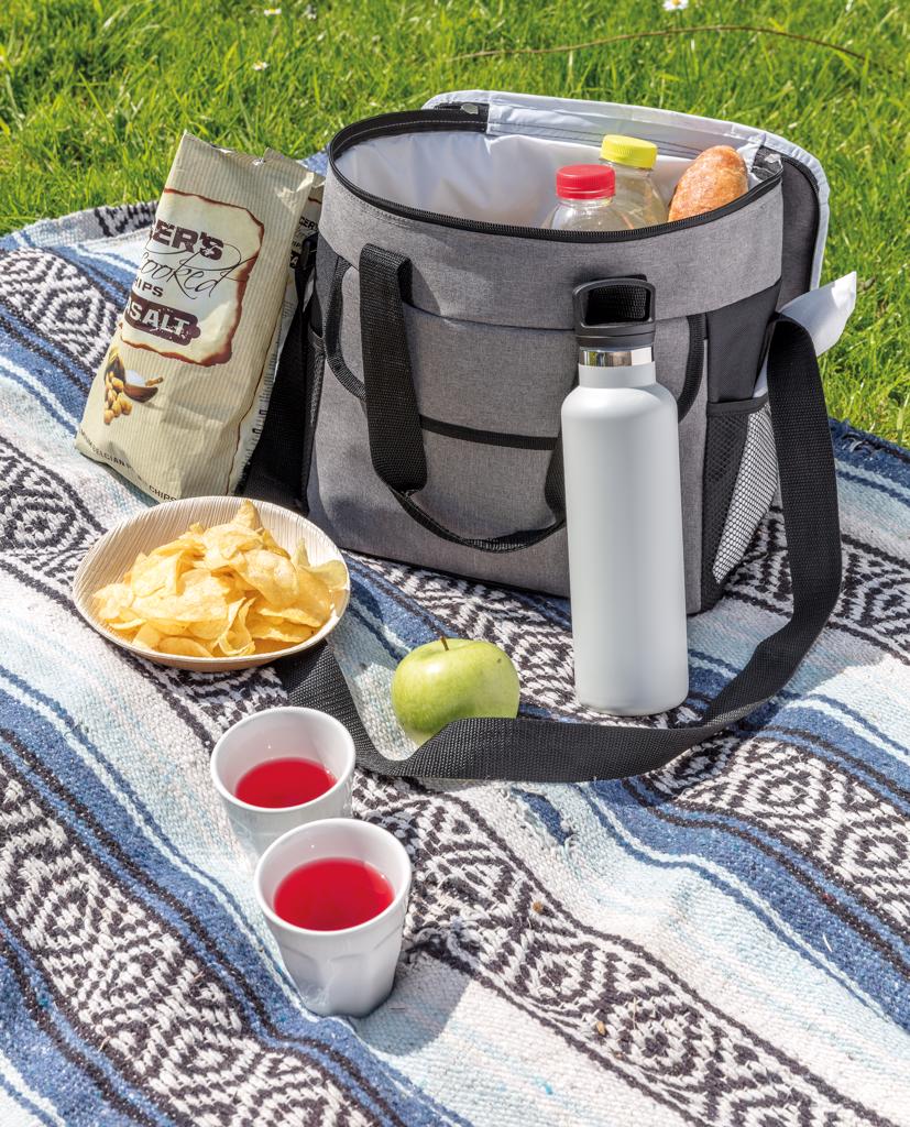 600D Polyester Kühltasche mit modischem 2-Farben-Look bietet Ihnen Platz für bis zu 20 Dosen. Die Tasche bietet noch extra Stauraum mit zwei Seiten- und einer Vordertasche.