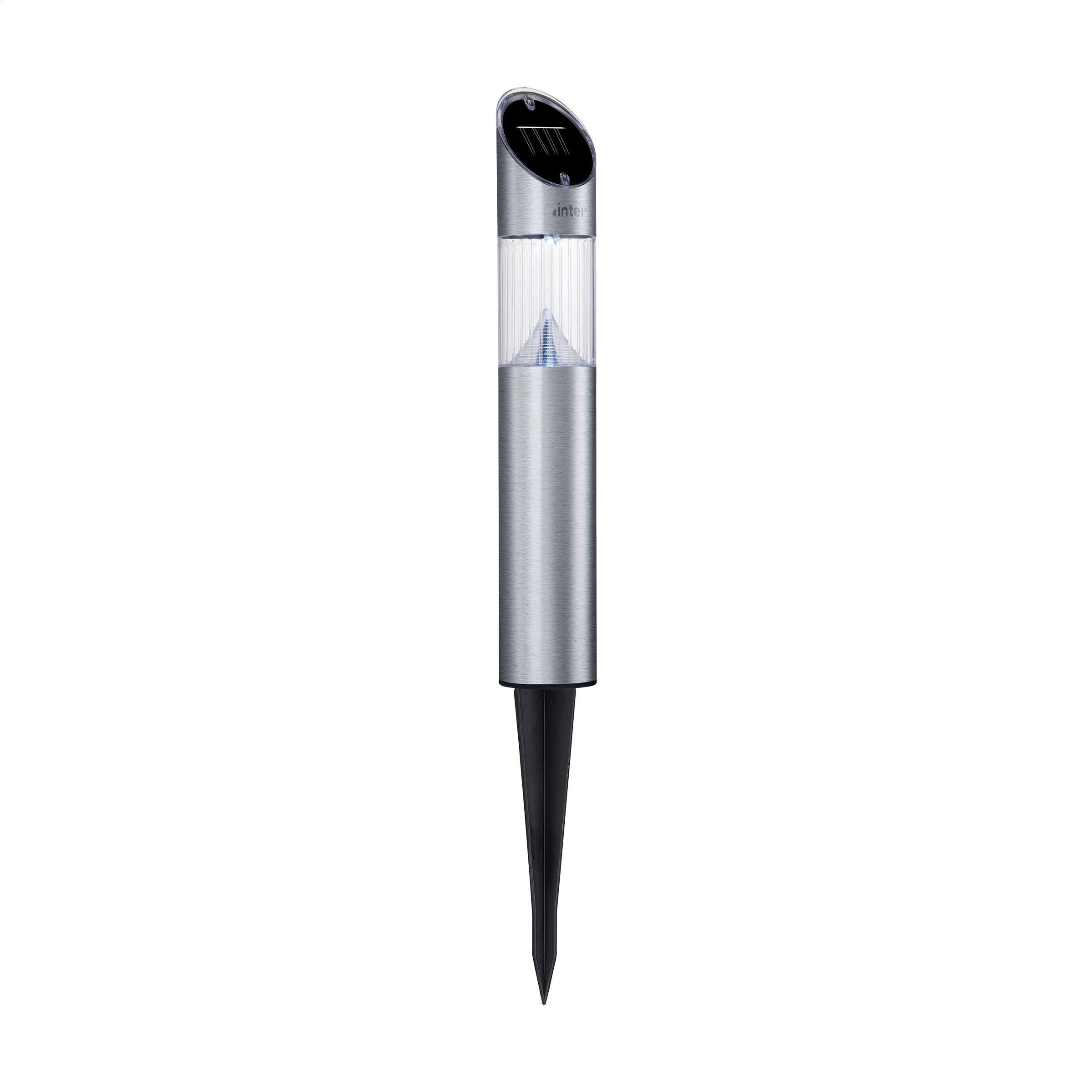 Grundig Solar-LED-Lampe. Aus einer Kombination von Edelstahl und Kunststoff. Sobald es dunkel wird, schaltet sich das weiße Licht (2 LEDs) automatisch ein. Die ideale solarbetriebene Beleuchtung für den Garten oder die Einfahrt. Mit Erdspieß und leicht zu bewegen. Nach vollständiger Aufladung bietet die Lampe 6 bis 8 Stunden Licht. Spritzwassergeschützt. Das Gehäuse aus Edelstahl ist wetterfest. Enthält wiederaufladbare AAA Ni-Mh 1,2 V-Batterie (600 mAh).