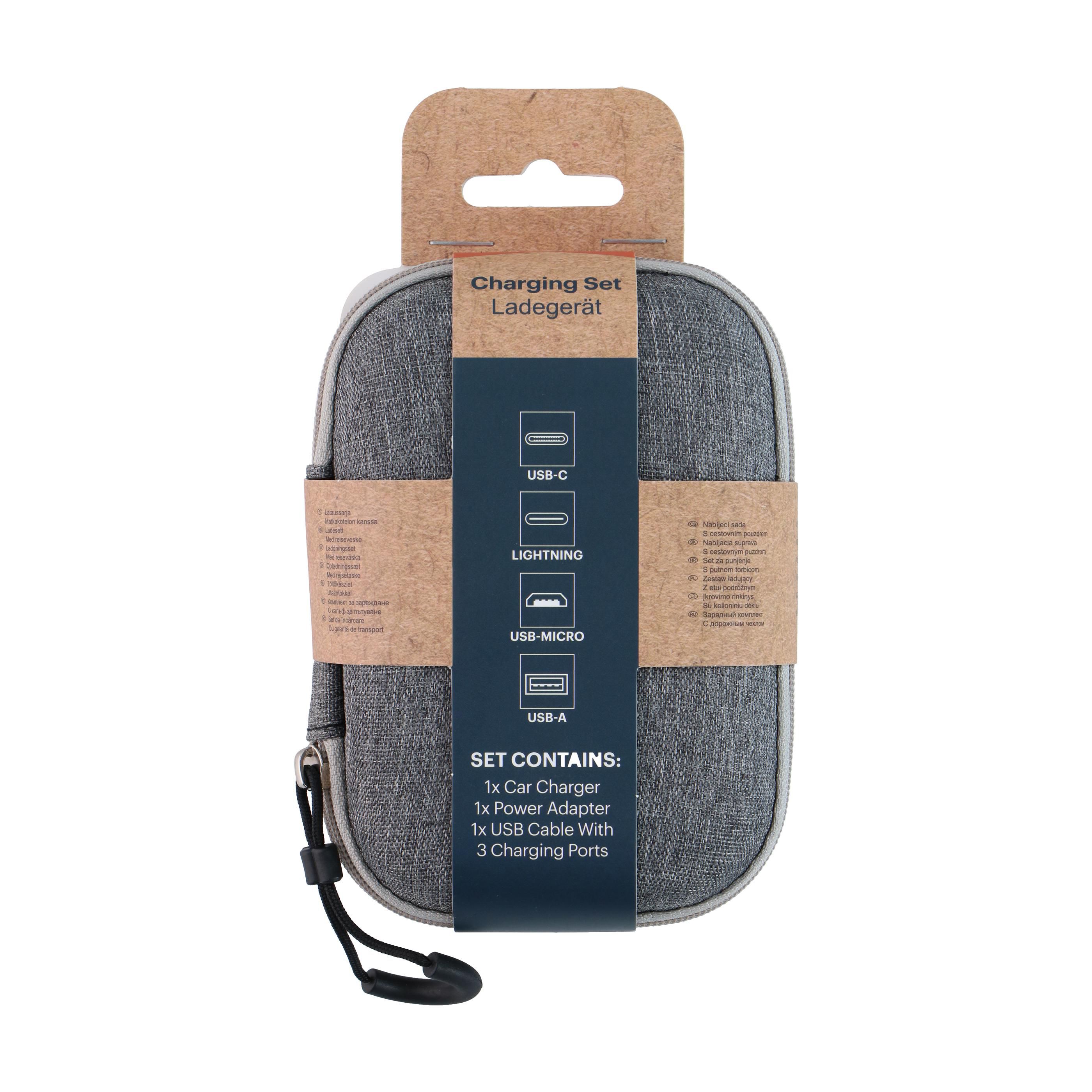 Komplettes Reise-Ladegerät der Marke Grundig. Inhalt: • 3-in-1-Ladekabel, geeignet für USB-C-, USB-A- und Lightning-Geräte • Autoladegerät • Netzteil. Geeignet für Smartphones, Tablets und andere USB-Geräte. Alles ordentlich verstaut in einem kompakten, robusten Aufbewahrungskoffer. Ideal für unterwegs, im Urlaub oder im Büro.