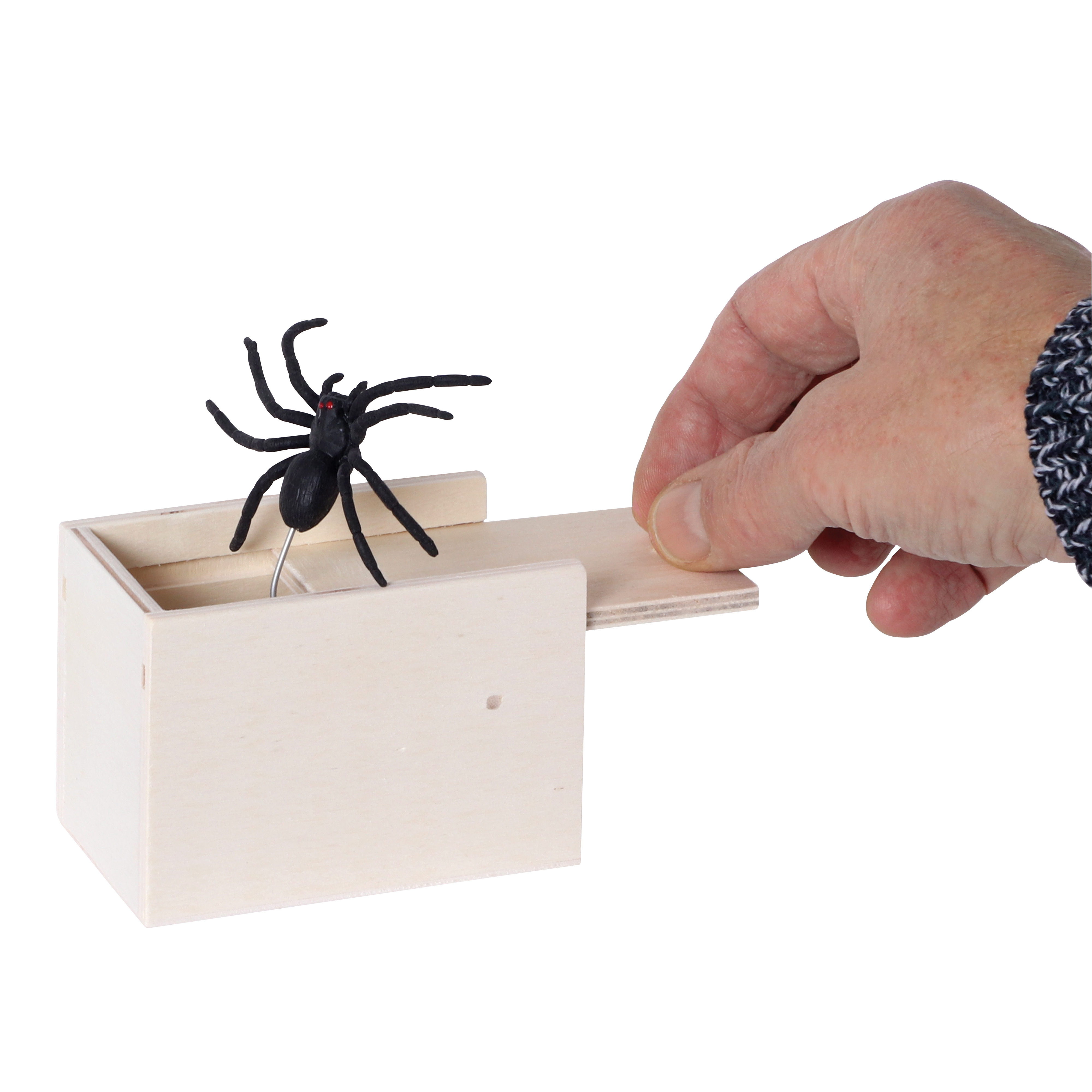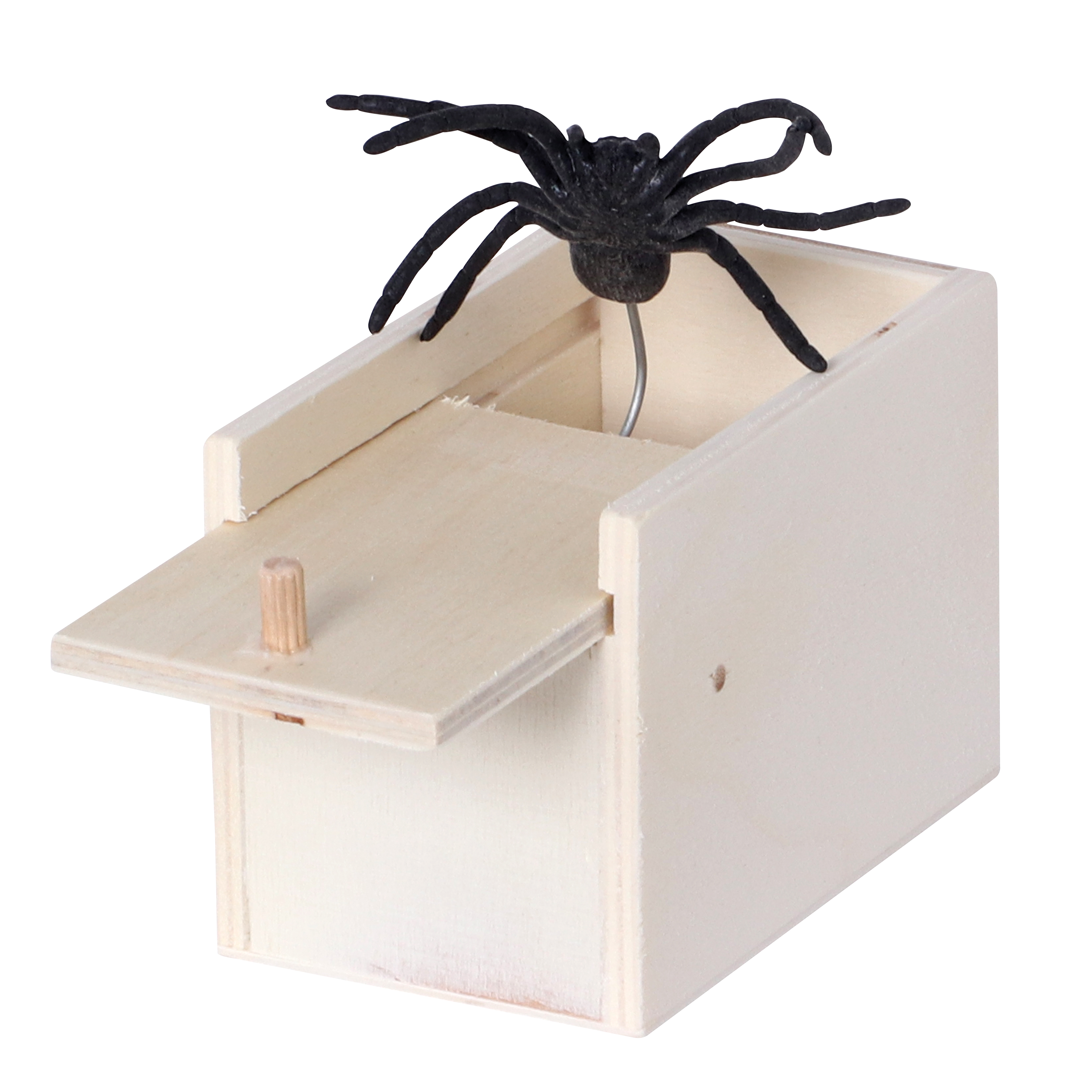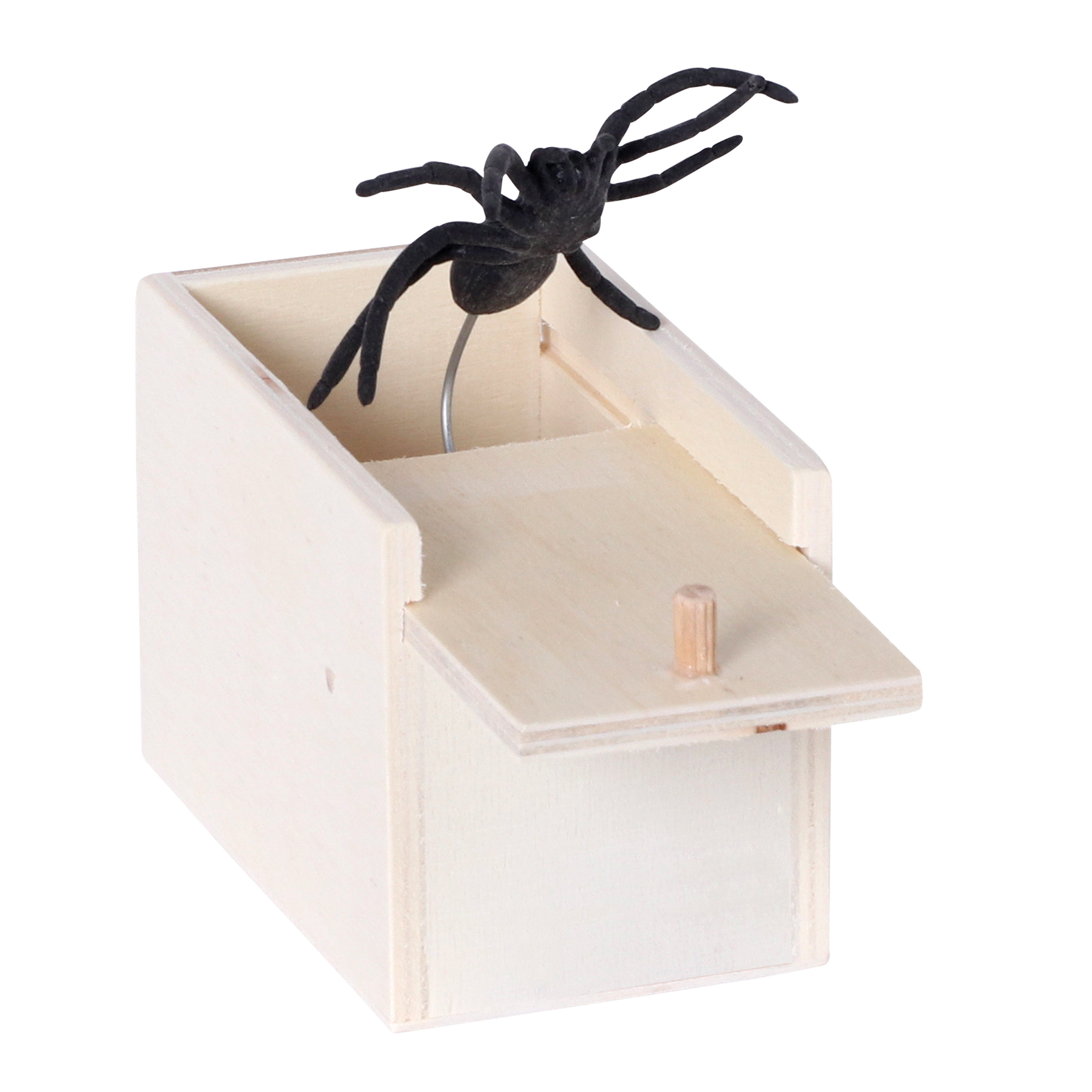 Holzbox 9 x 6x6,5cm mit Schock-Effekt! Öffnet man den Schiebedeckel springt eine gruselige Spinne hervor!