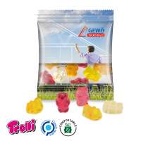 Trolli Team Gummibärchen im Flowpack aus weißer, kompostierbarer Folie, individuell bedruckt. Inhalt: Trolli Fruchtgummi Team Bärchen in Premium Qualität mit 10 % Fruchtsaftanteil, bunt gemischt aus den Sorten, Zitrone, Erdbeere, Orange,...