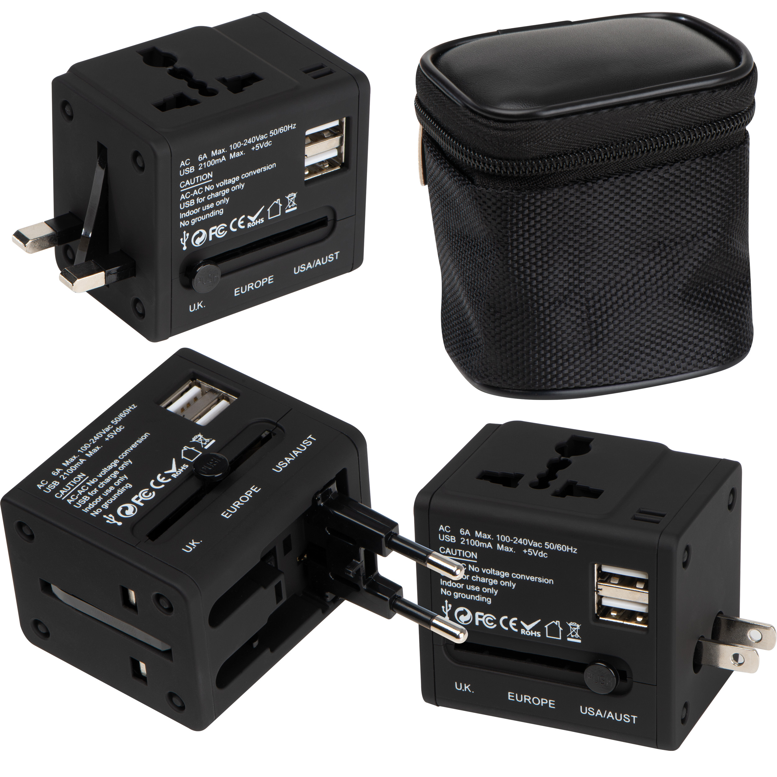 Gummierter Reiseadapter in einem Etui mit Adaptern für alle Länder und 2 USB Anschlüssen. Hiermit können Sie Ihre Geräte auf der ganzen Welt laden und nutzen. Der Werbeaufdruck erfolgt auf das Etui.