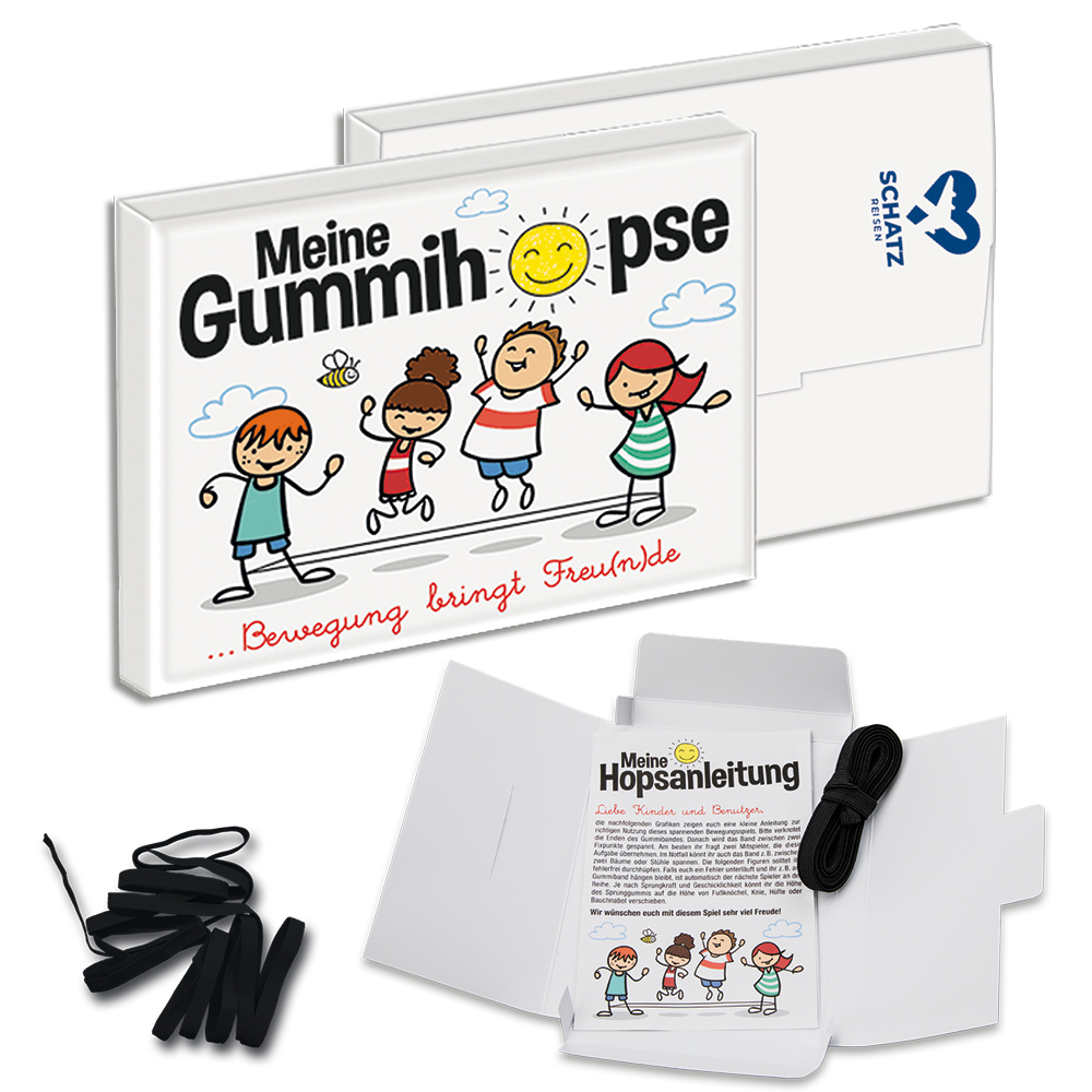 Erleben Sie den Klassiker aus der Kindheit neu! Mit dem Gummitwist (auch Gummihopse genannt) bringen wir ein spaßiges und aktives Spiel zurück. Das Set enthält ein Gummiband sowie eine Spielanleitung, die Kindern und Erwachsenen zeigt, wie man mit diesem einfachen Spiel viel Freude haben kann und in Bewegung bleibt. Die Lieferung erfolgt in einer ansprechend gestalteten Mappe. Die Varianten: • Standardausführung: Ab Lager lieferbar, optional mit zusätzlichem Logoeindruck. • Individuelle Gestaltung: Ab 500 Stück mit personalisierter Mappe und Hopsanleitung für ein einzigartiges Design.
