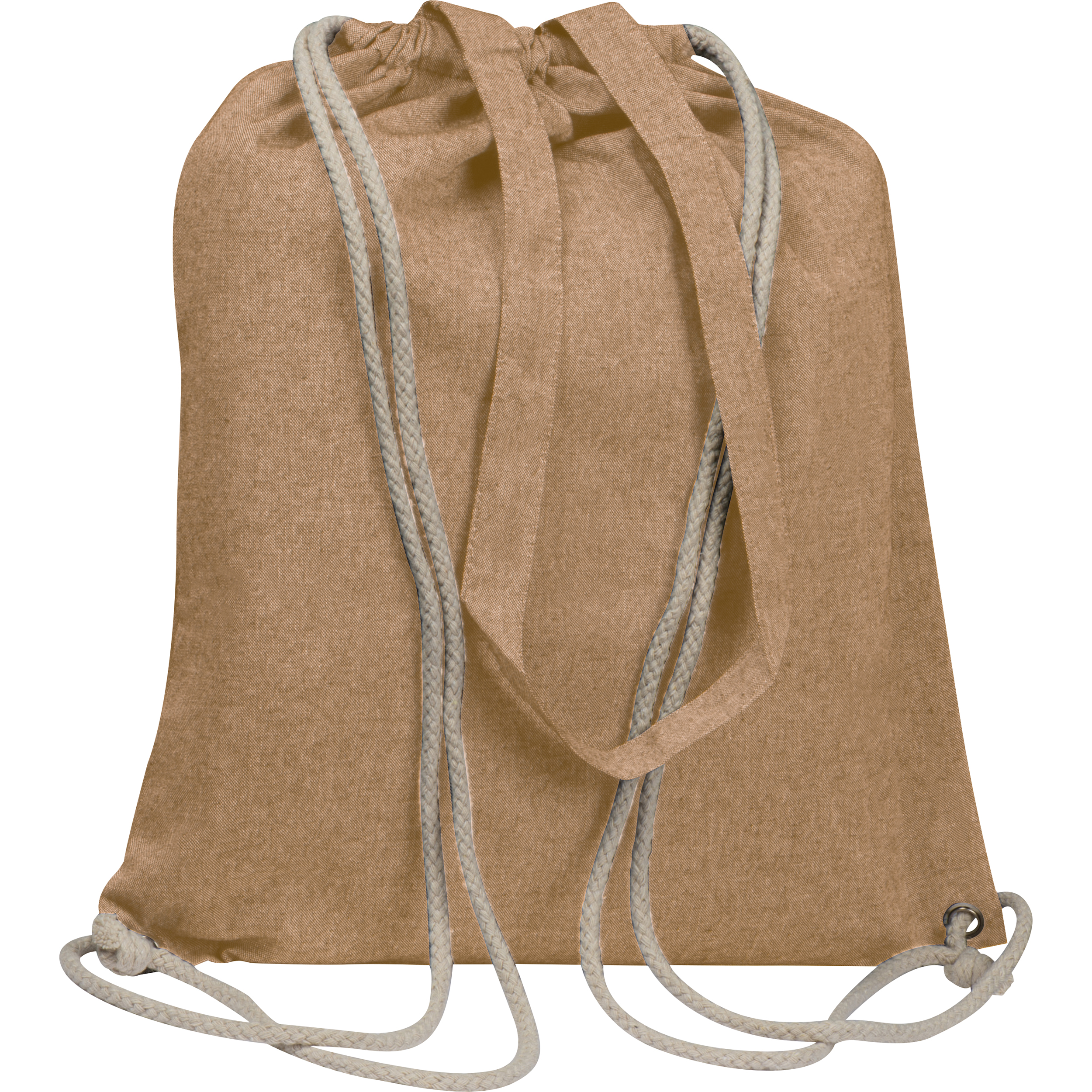 Oeko-Tex® STANDARD 100 zertifizierter Gymbag aus recycelter Baumwolle. Grammatur 140g / m². Die Werbung wird auf eine Seite der Tasche gedruckt.