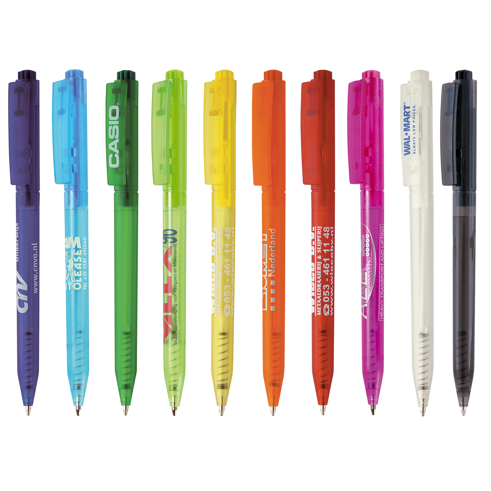 HALLIGEN transparente Kunststoff Kugelschreiber Peekay, gefrosteter Plastik-Kugelschreiber mit Schaft und Clip aus 1 Teil, mit einzigartigem Clip-Druck-Mechanismus und mit blauschreibender Mine X-20