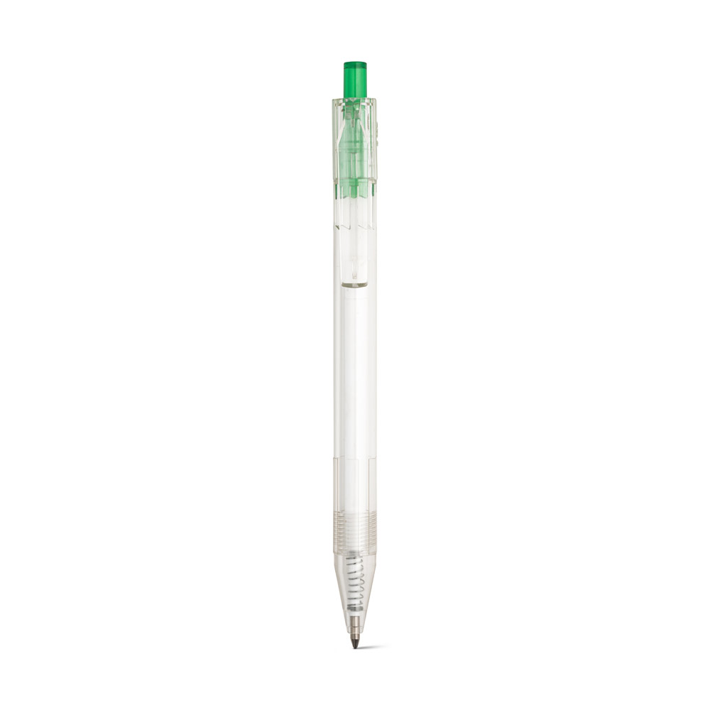 Kugelschreiber aus transparentem 100% rPET mit farbigem Druckknopf und schwarzschreibender Mine. ø11 x 142 mm