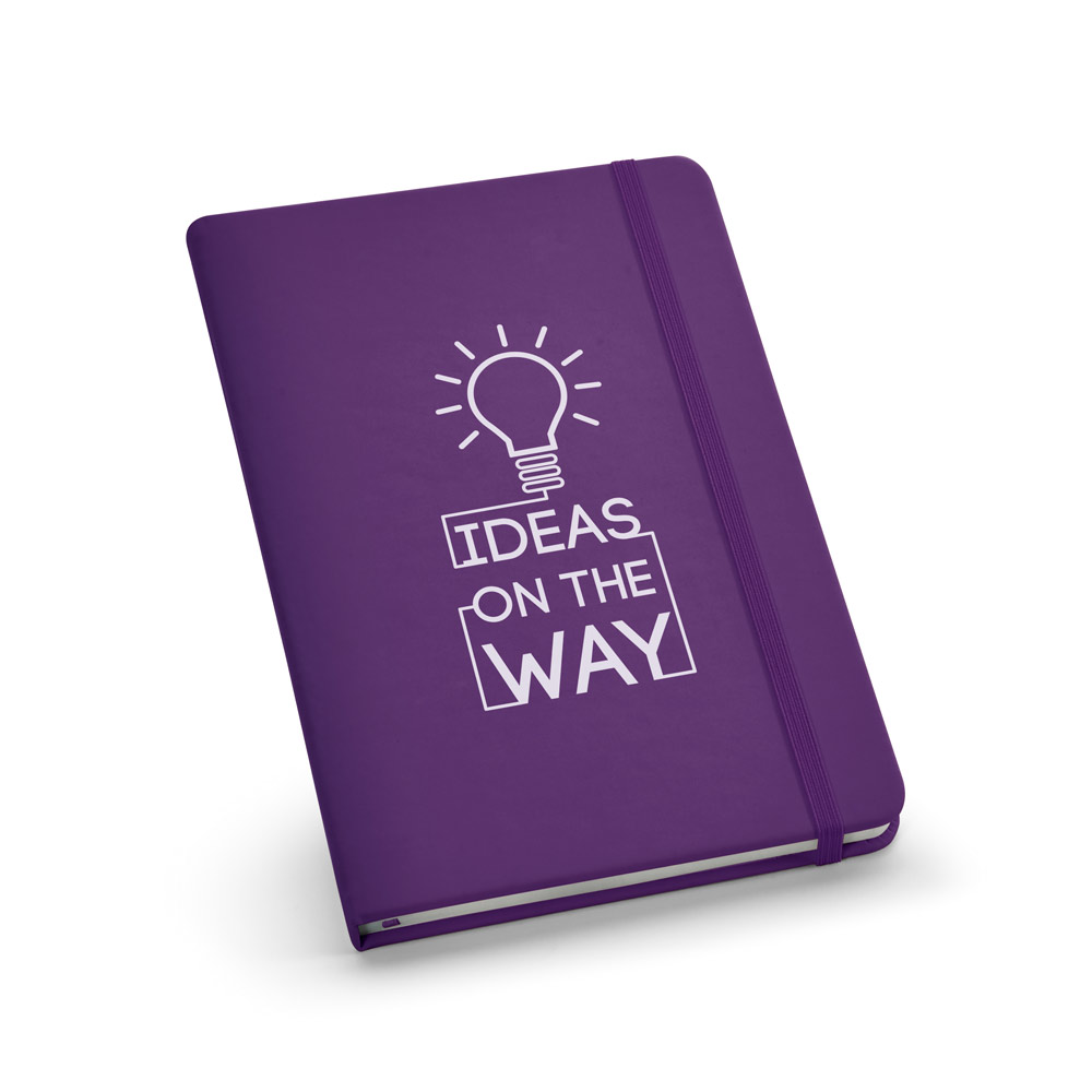 Notizbuch A5 mit 160 unlinierten Seiten (70 g / m²) 100 % Recycling, Hardcover aus PU und einem Gummiband. 140 x 210 mm