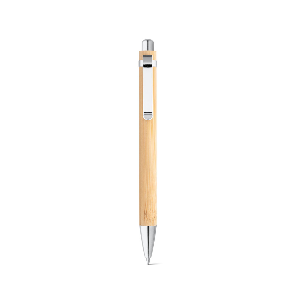 Kugelschreiber aus Bambus mit Clip aus Metall. Da das Produkt aus natürlichen Materialien hergestellt wird, können Farbe des Produkts sowie das Druckergebnis von Produkt zu Produkt unterschiedlich sein. ø11 x 138 mm