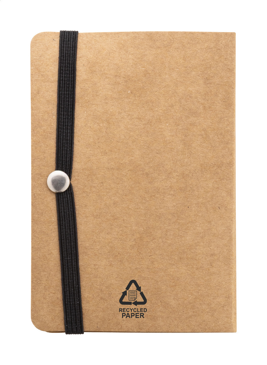Kartenhalter aus Kraftpapier mit Haftnotizen aus Recyclingpapier und elastischem Verschlussband. Inklusive 25 Blatt gelber Haftnotizen und 125 Lesezeichen (in 5 Farben).