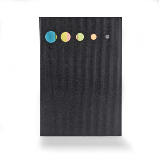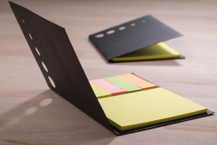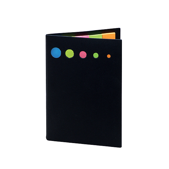Haftnotizen in 5 Farben und Taschennotizbuch mit schwarzem Umschlag. Das Logo wird mit der Tampondruck-Metode aufgetragen.