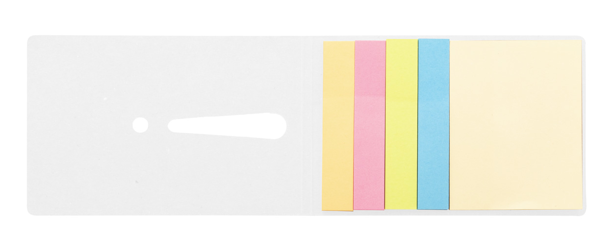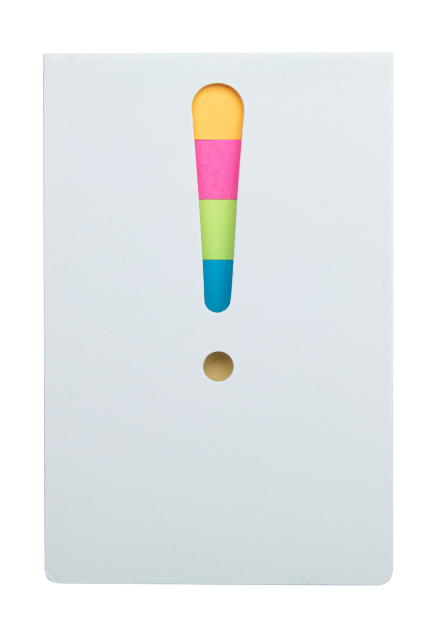 Haftnotizblock mit 25 großen, 100 kleinen Haftnotizblättern (in 4 Farben) und einem ausgestanzten Ausrufezeichen auf dem Cover.