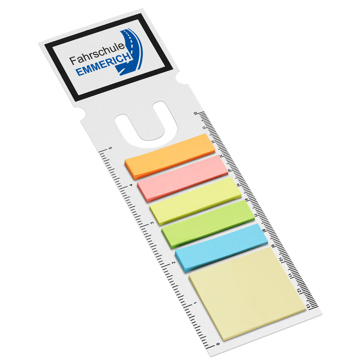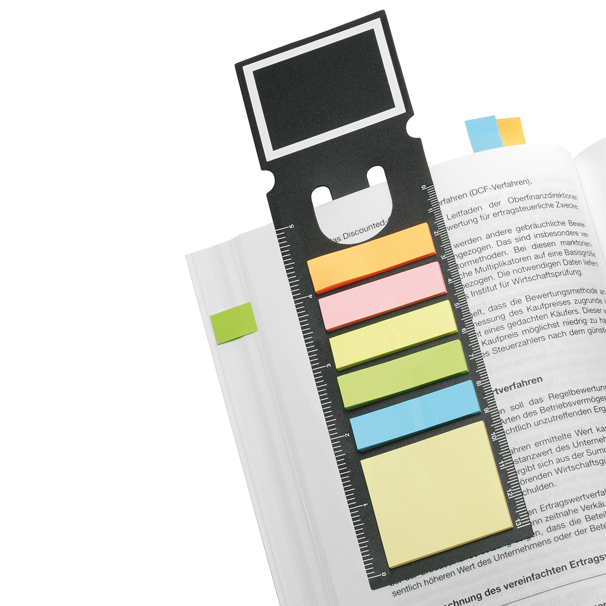 Haftnotizen-Lesezeichen mit je ca. 25 Markern in 6 Farben (ca. 12 x 45 mm, ca. 40 x 45 mm) und gedr. Skalen (13 cm/5 Inch)