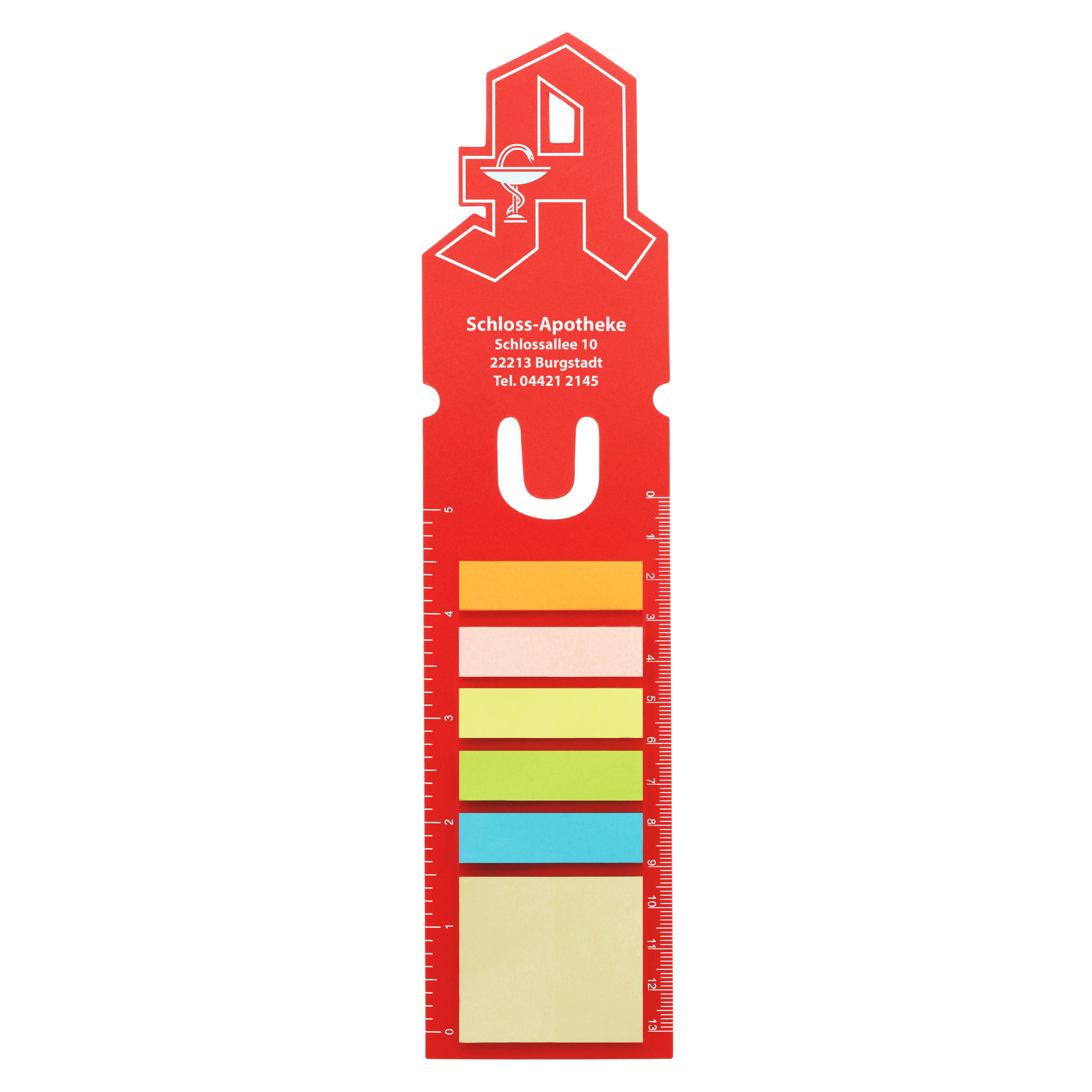 Haftnotizen-Lesezeichen "Apotheke" mit jeweils ca. 25 Haftnotizmarkern in 6 verschiedenen Farben (ca. 12 x 45 mm und ca. 40 x 45 mm) und gedruckten Skalen (13 cm und 5 Inch). Besonders geeignet für Mailings.