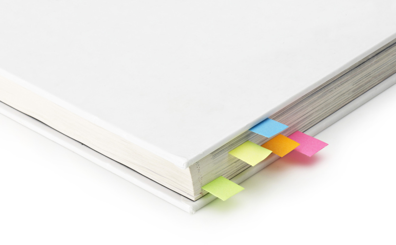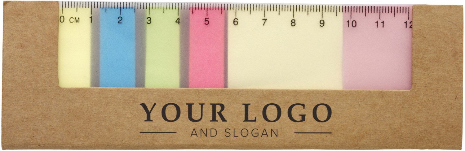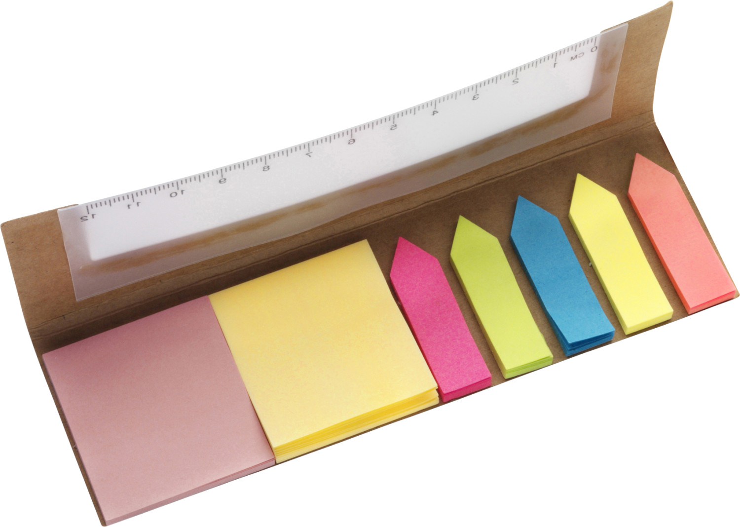Haftnotizen-Set inklusive Lineal aus Kunststoff, 5 x 25 Haftnotizen im kleinen Format und 2 x 25 im großen Format.