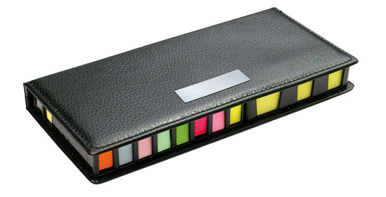 Haftnotizen : 2 größere Blöcke und 8 kleinere Blöcke in vielen Farben. Gepackt in eine Box mit Kalender für 2 Jahre. Das Logo wird auf dem Metallplättchen graviert und auf dem Etui plaziert. Das Metallplättchen ist separat verpackt.