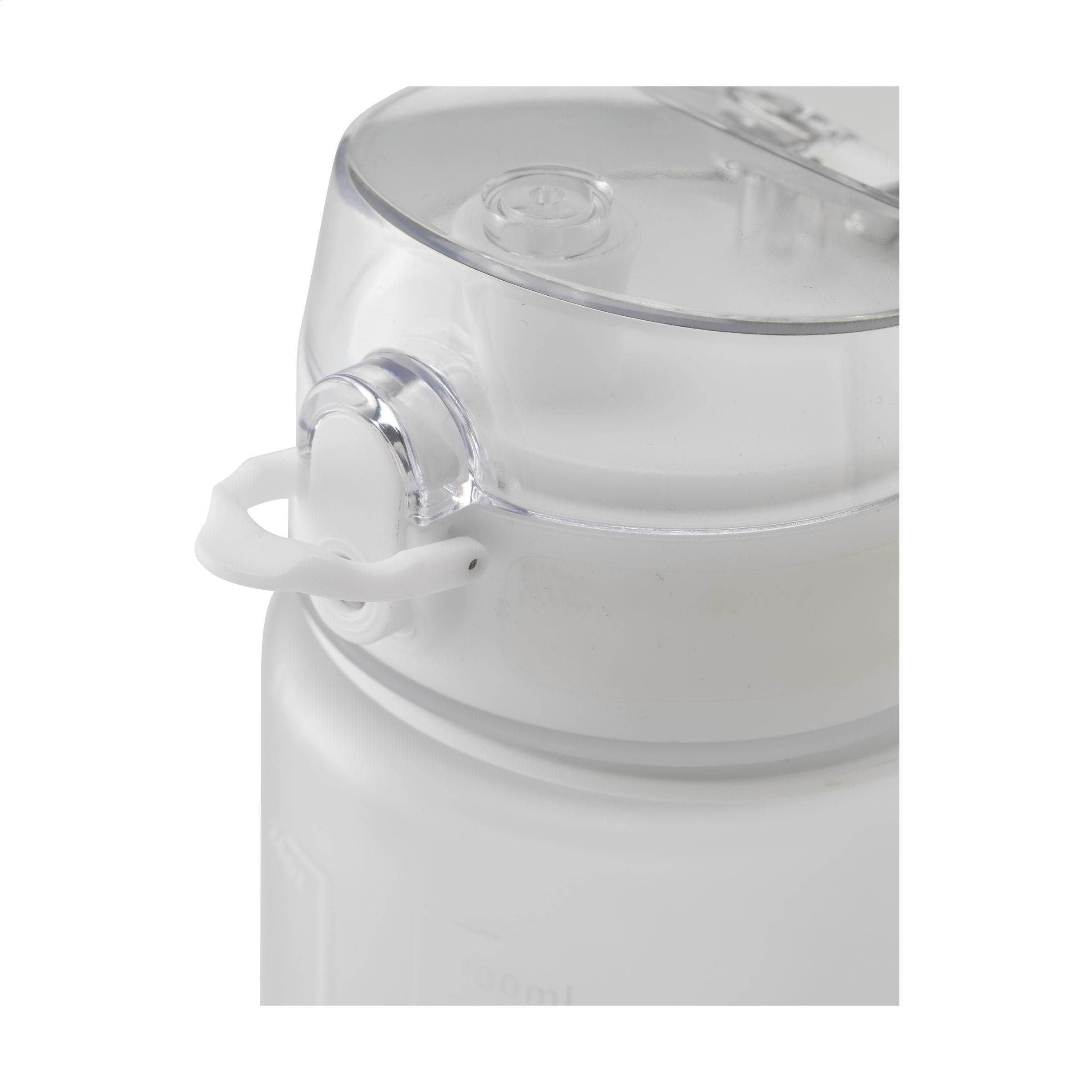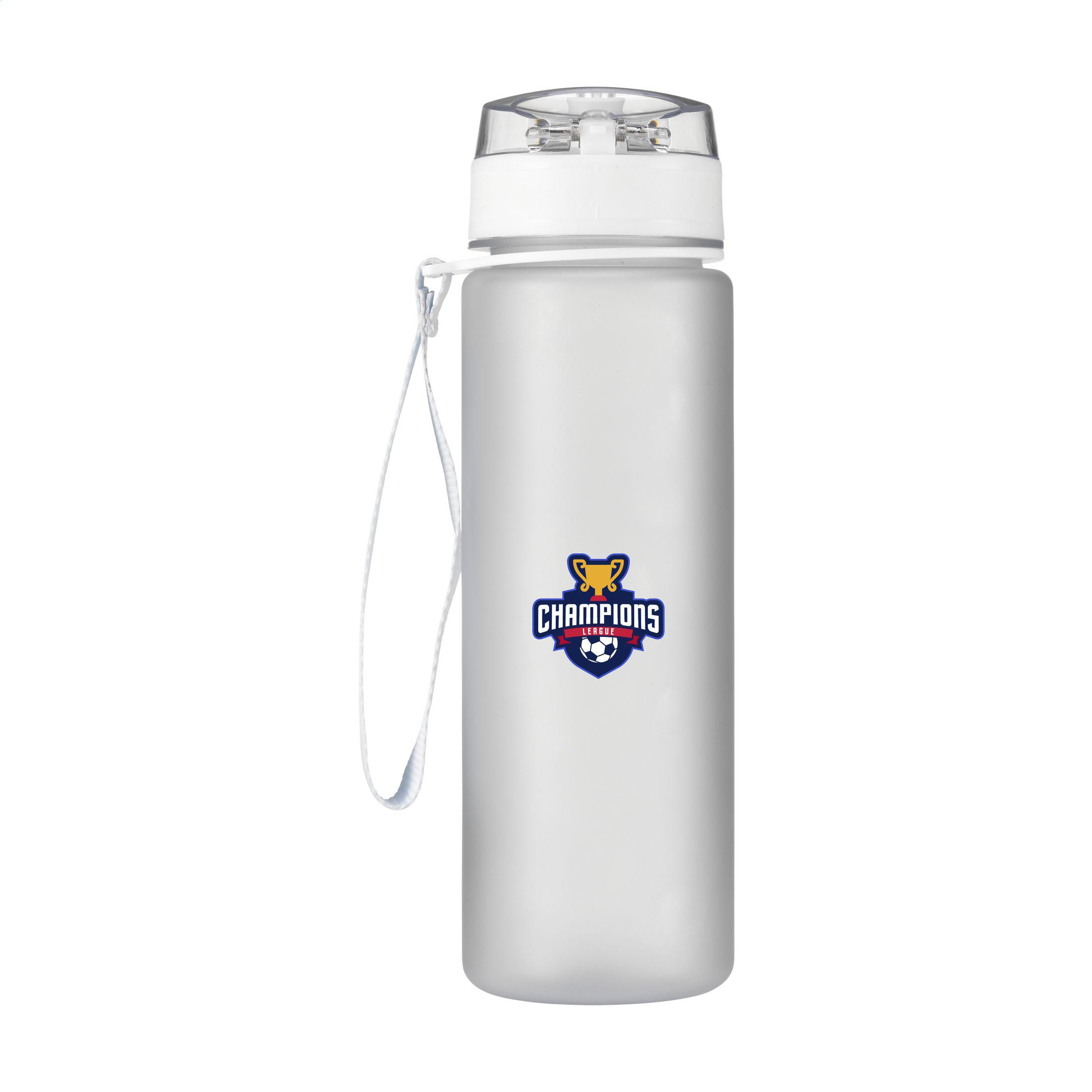 Matt transparente Kunststoff-Wasserflasche mit auslaufsicherem Schraubverschluss und praktischer Trageschlaufe. Der Schraubverschluss hat eine Trinktülle und ist mit einem transparenten Deckel mit Druckknopf und Verschluss hygienisch verschlossen. Mit Inhaltsangabe in ml und oz auf der Außenseite der Flasche. Nicht spülmaschinengeeignet. Fassungsvermögen 750 ml.