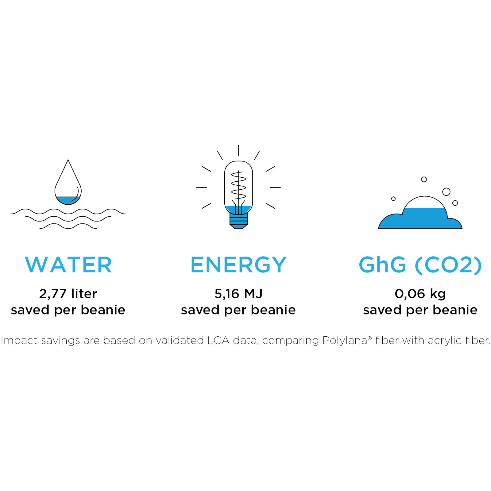 Die Hale Mütze besteht aus Polylana® Fasern - einer umweltfreundlichen Alternative zu 100% Acryl- und Wollfasern - und spart so Wasser, Energie und reduziert den CO2-Ausstoß während des Produktions- und Färbeprozesses. Im Vergleich zu Acrylfasern werden für jede Hale Mütze folgende Einsparungen erzielt: 2,77 Liter Wasser, 5,16 MJ Energie und 0,06 kg GhG (CO2). Die Einsparungen basieren auf validierten Daten der Ökobilanz (LCA). Hergestellt aus 1 x 1 Rippstrick mit Polylana® Fasern und Acryl mit einer Dichte von 12 Gauge. Die ideale Wahl für alle, die Wert auf Mode legen und gleichzeitig die Umwelt schonen wollen.