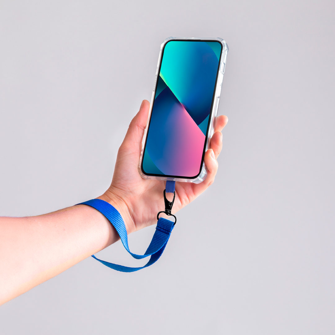 Originelles Armband mit Halter aus weichem Polyester, geeignet für alle Handgelenke und mit Tragezubehör das zwischen der Hülle und dem Smartphone platziert werden kann. Passender Tragegurt und schwarzer Metall-Wirbelkarabiner. In vielen Farben erhältlich.