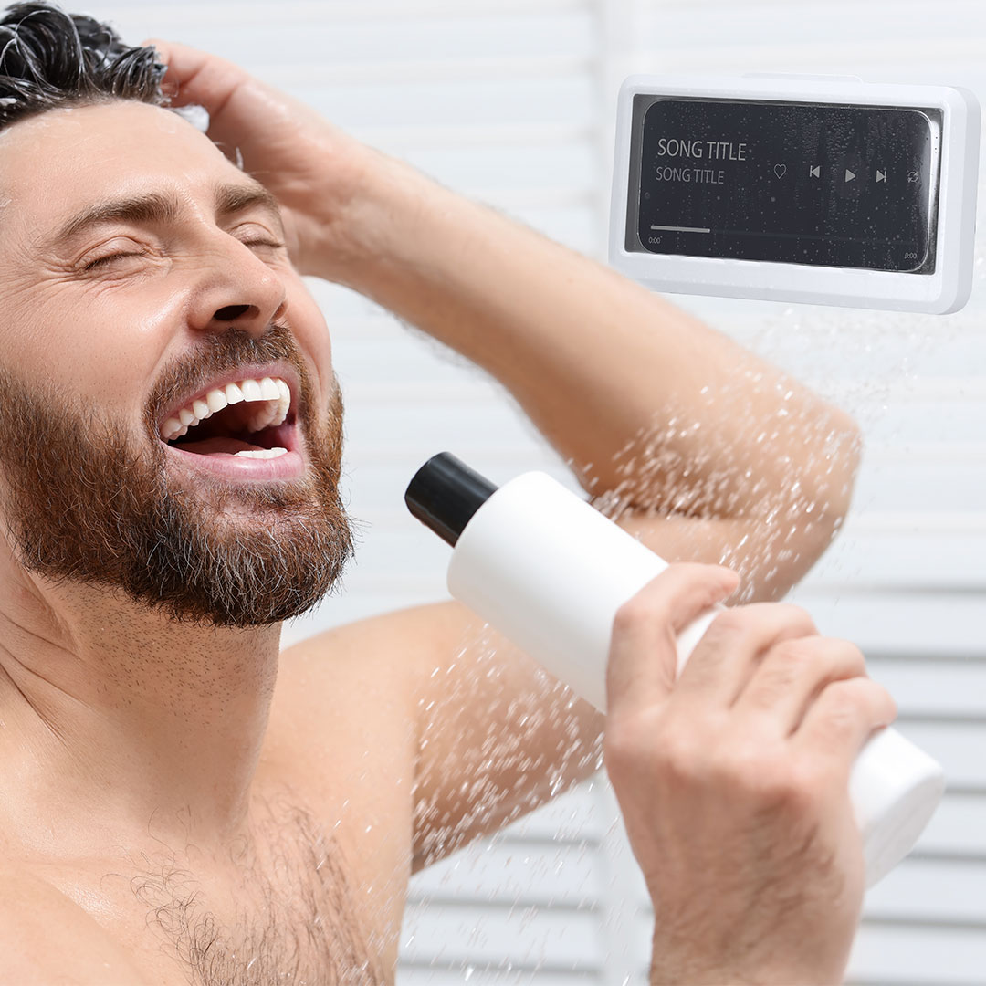Wasserdichter Smartphone-Halter, ideal für die Verwendung in der Dusche. Kompatibel mit allen Arten von Smartphones, verfügt über einen großen Touchscreen für eine bequeme Nutzung des Geräts. Beinhaltet einen schwenkbaren Halter mit 360°-Drehung, der es ermöglicht, die Position des Geräts anzupassen. Die Installation ist schnell und einfach dank des robusten doppelseitigen Klebers an der Basis.