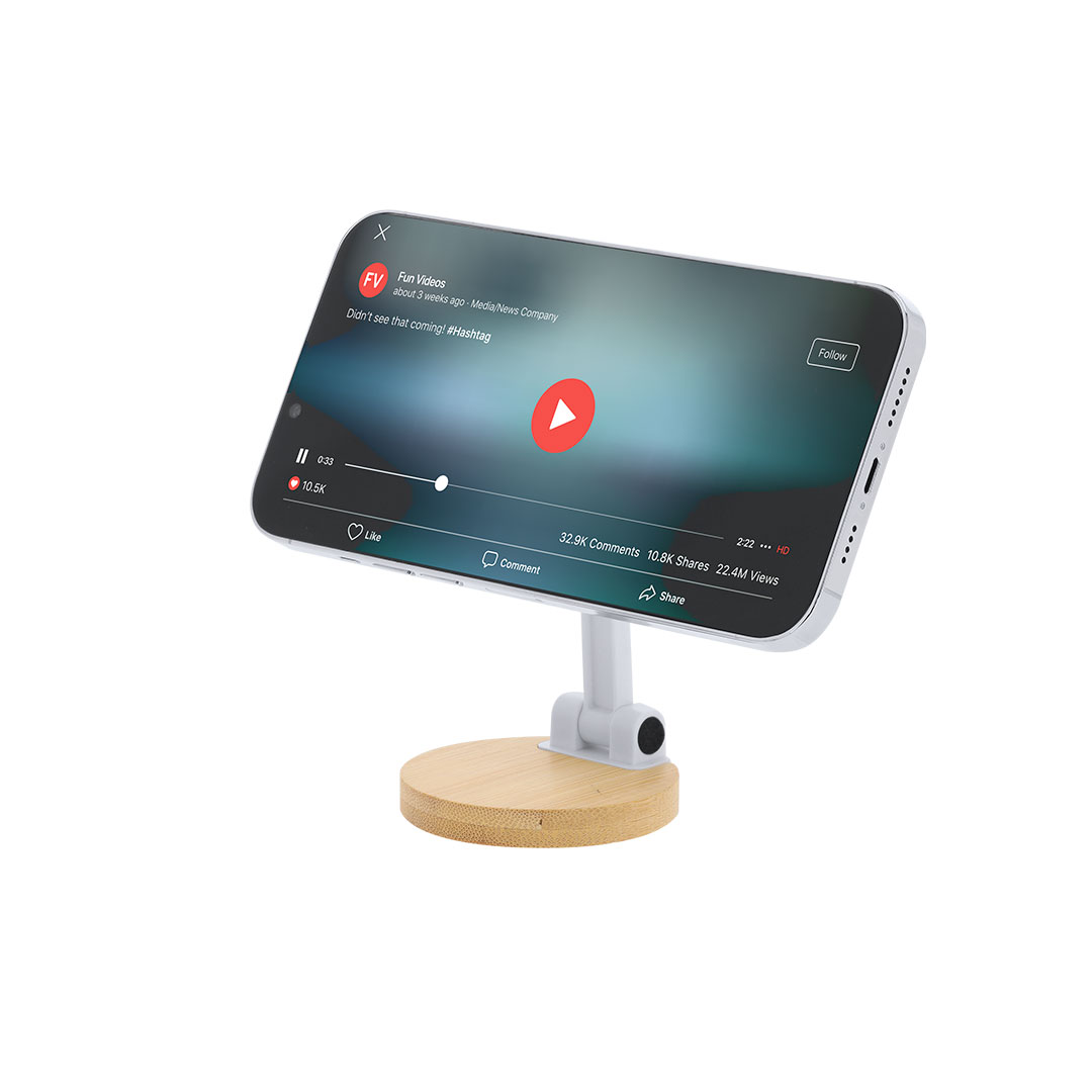 Faltbarer Ständer für Smartphones. Mit magnetischer Befestigung, MagSafe und verstellbarer Position für mehr Komfort. Inklusive einem klebbaren Metallring. Materialien wie Bambus fördern die Verwendung von natürlichen Rohstoffen und reduzieren die Emissionen schädlicher Stoffe. Er stammt von einer Pflanze mit hoher Festigkeit und Vielseitigkeit, die schnell wächst und sich regeneriert und eine hervorragende Alternative zur Verwendung von traditionellem Holz darstellt.