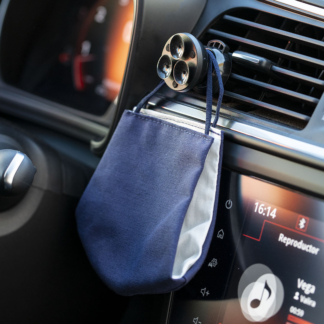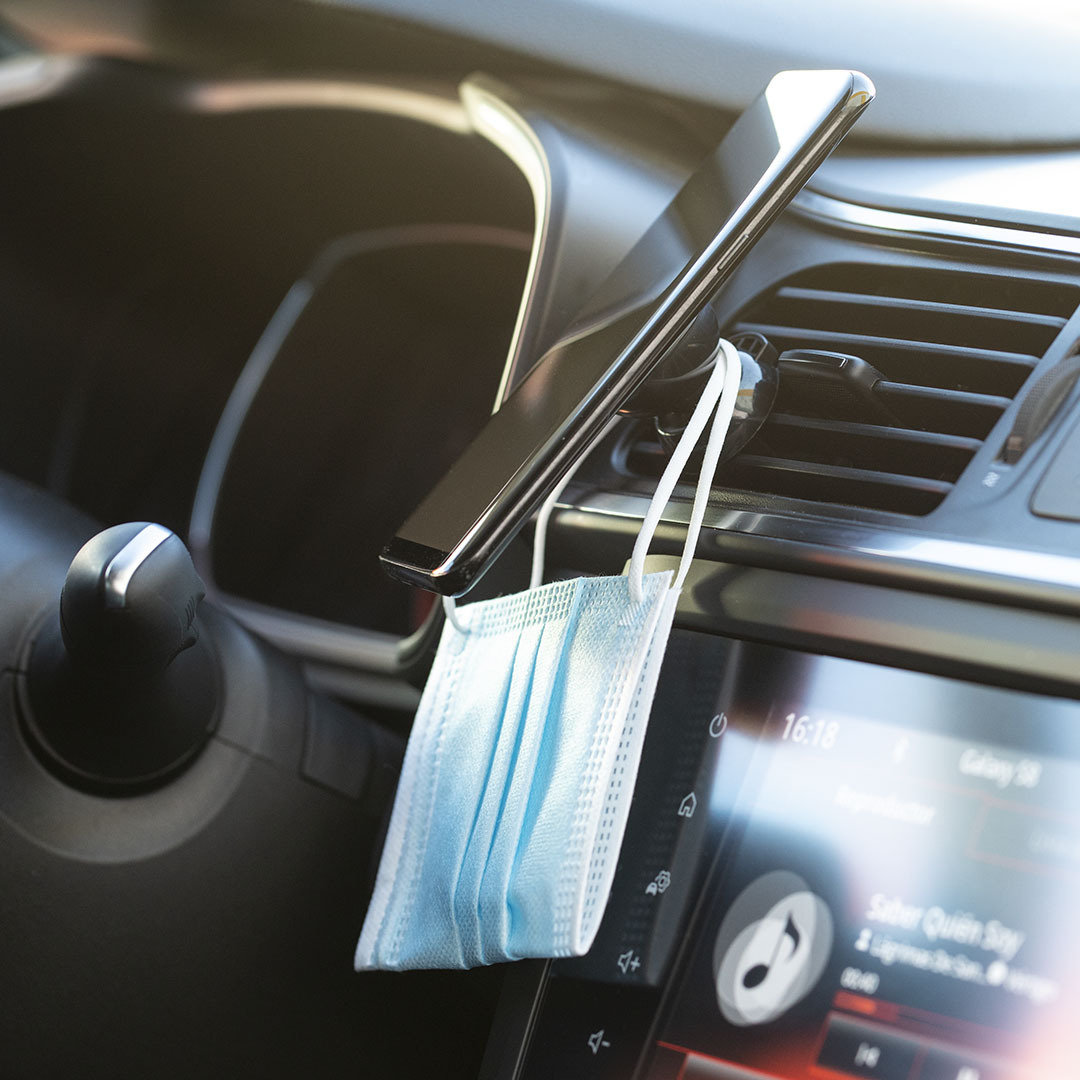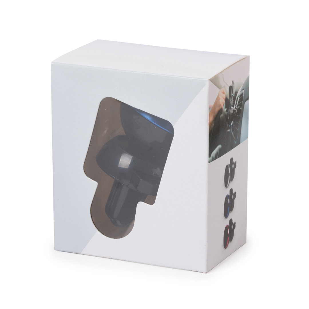 Smartphone-Halter in elegantem Schwarz für die KFZ-Lüftung mit Befestigung des Gerätes mittels Saugnäpfen. Mit 360º Drehmechanismus und bis zu 45º Neigung. Präsentiert in einer attraktiven Designbox.