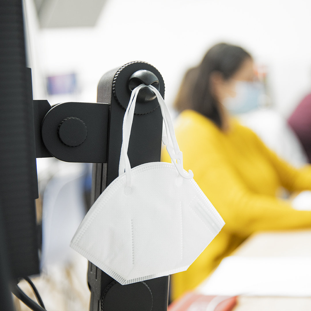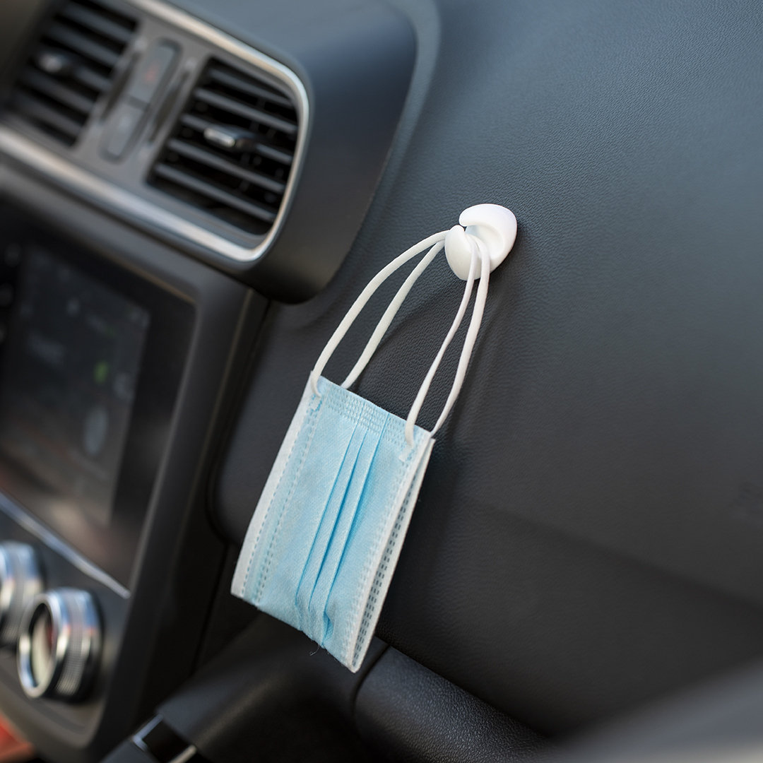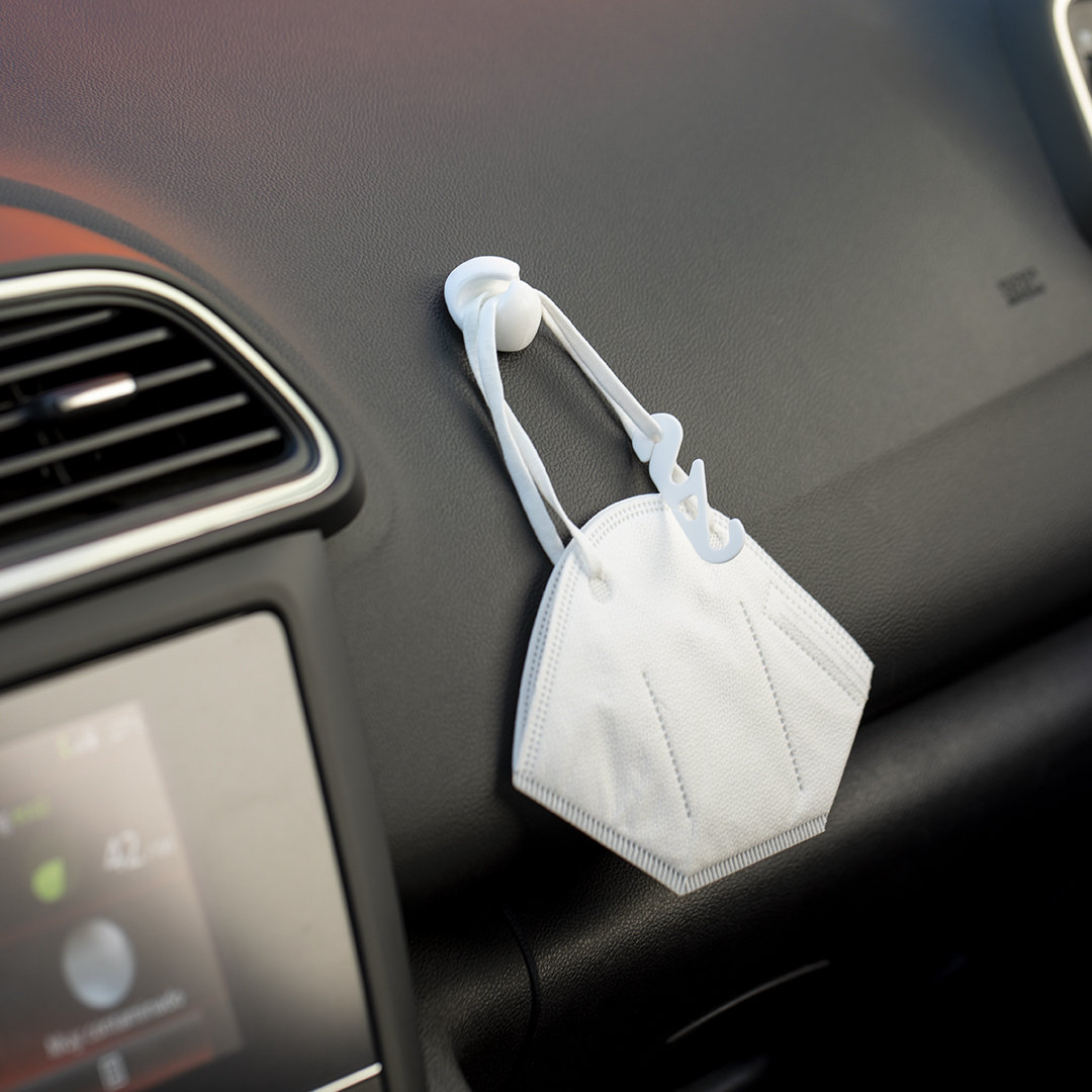 Multifunktionale, selbstklebende Halterung aus weichem Gummi. Verwendbar für Schutzmasken, für Schlüsselbund, als Kabelhalterung ... Erhältlich in schwarz und weiß.