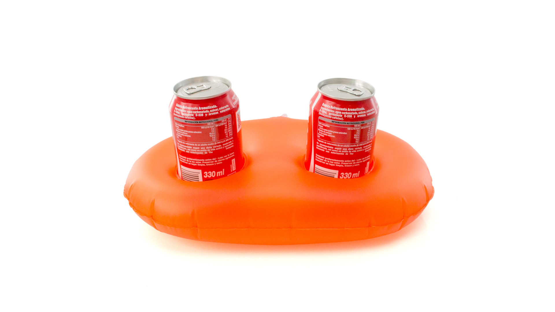 Aufblasbarer Getränkehalter aus robustem PVC in lebendigen Farben. Geeignet für 2 Dosen mit 330 ml Fassungsvermögen.