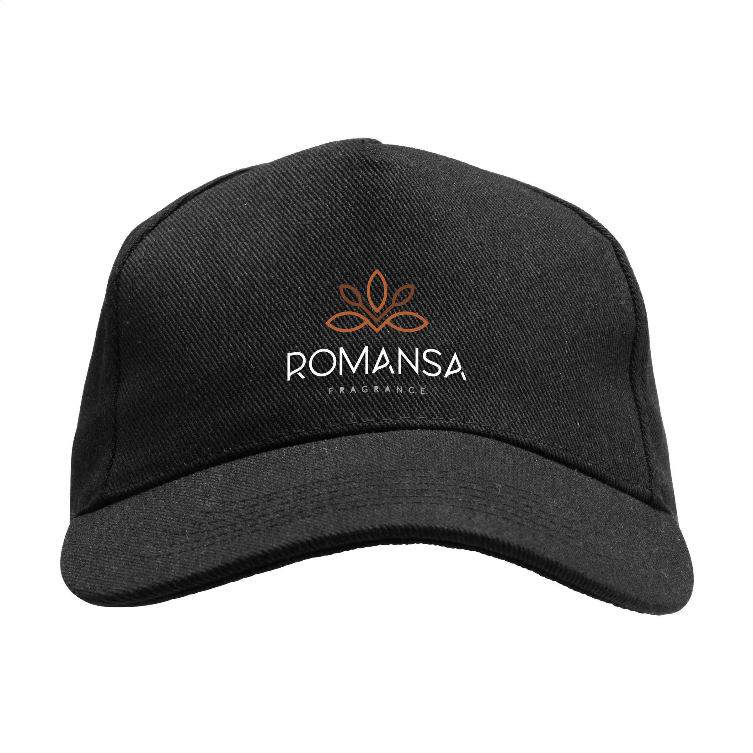 WoW! Komfortable Kappe in extra schwerer Qualität. Gefertigt aus 60% recycelter Baumwolle und 40% recyceltes Polyester. Mit vorgeformtem Schirm und verstellbarem Verschluss mit Metallclip auf der Rückseite. Diese Kappe mit 5 Panels hat einen gebogenen Schirm und gestickte Ösen zur Belüftung.