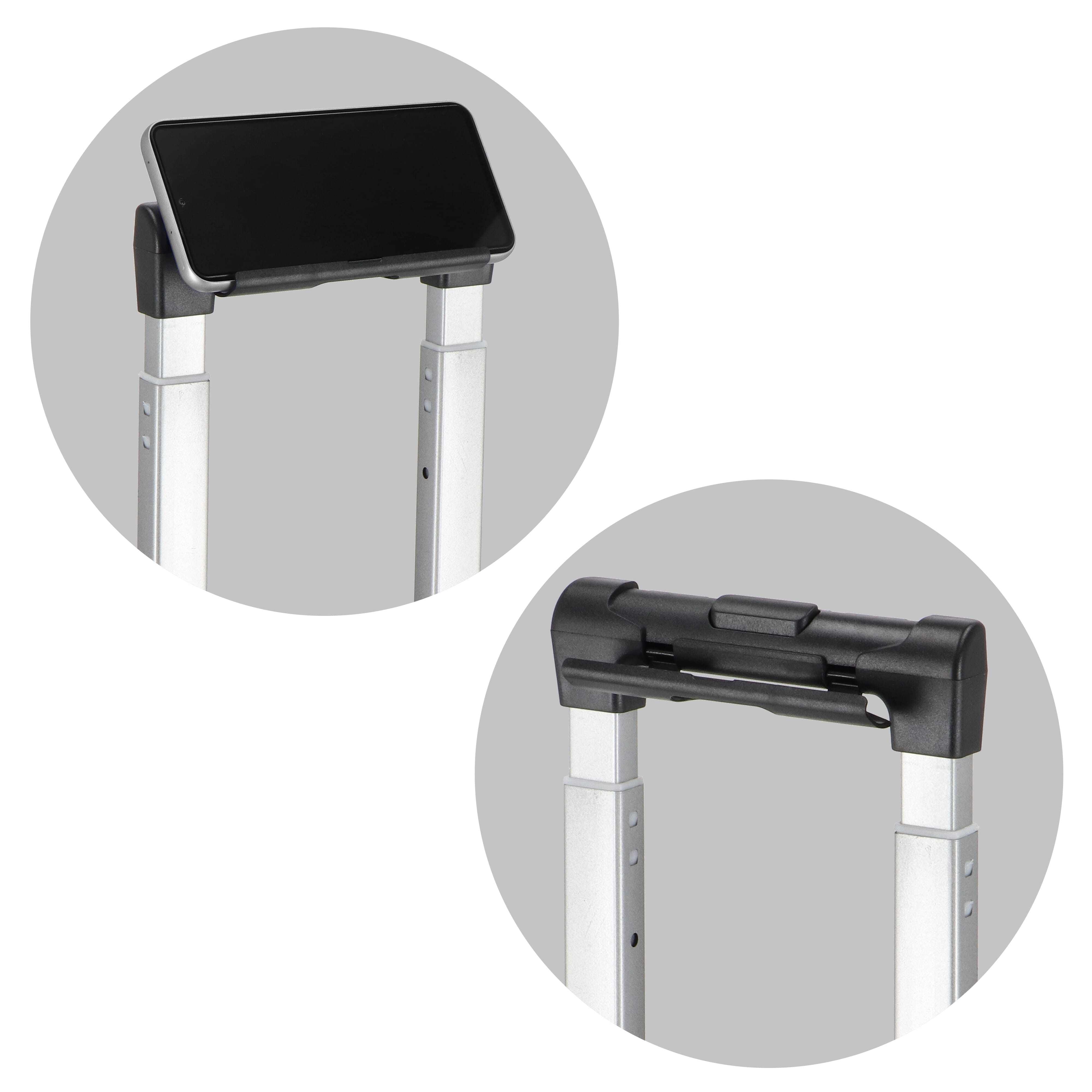 Dieser Kabinentrolley vereint Stauraum und Benutzerfreundlichkeit. Er passt in die meisten Flugzeugfächer und hält wichtige Utensilien griffbereit. Mit vier Lenkrollen, Zahlenschloss und Handyhalterung im Griff macht er das Warten am Flughafen, Bahnhof oder Bahnsteig deutlich angenehmer.