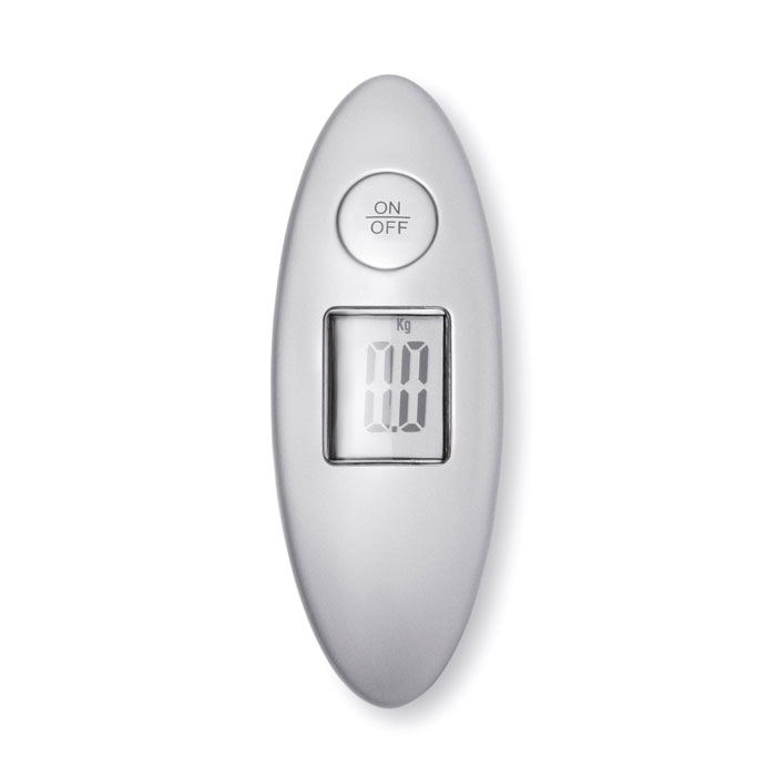 Handgepäckwaage. Maximale Kapazität: 40 kg. 1 Knopfzelle im Lieferumfang enthalten. Einzeln verpackt in silbernem Karton. ABS.