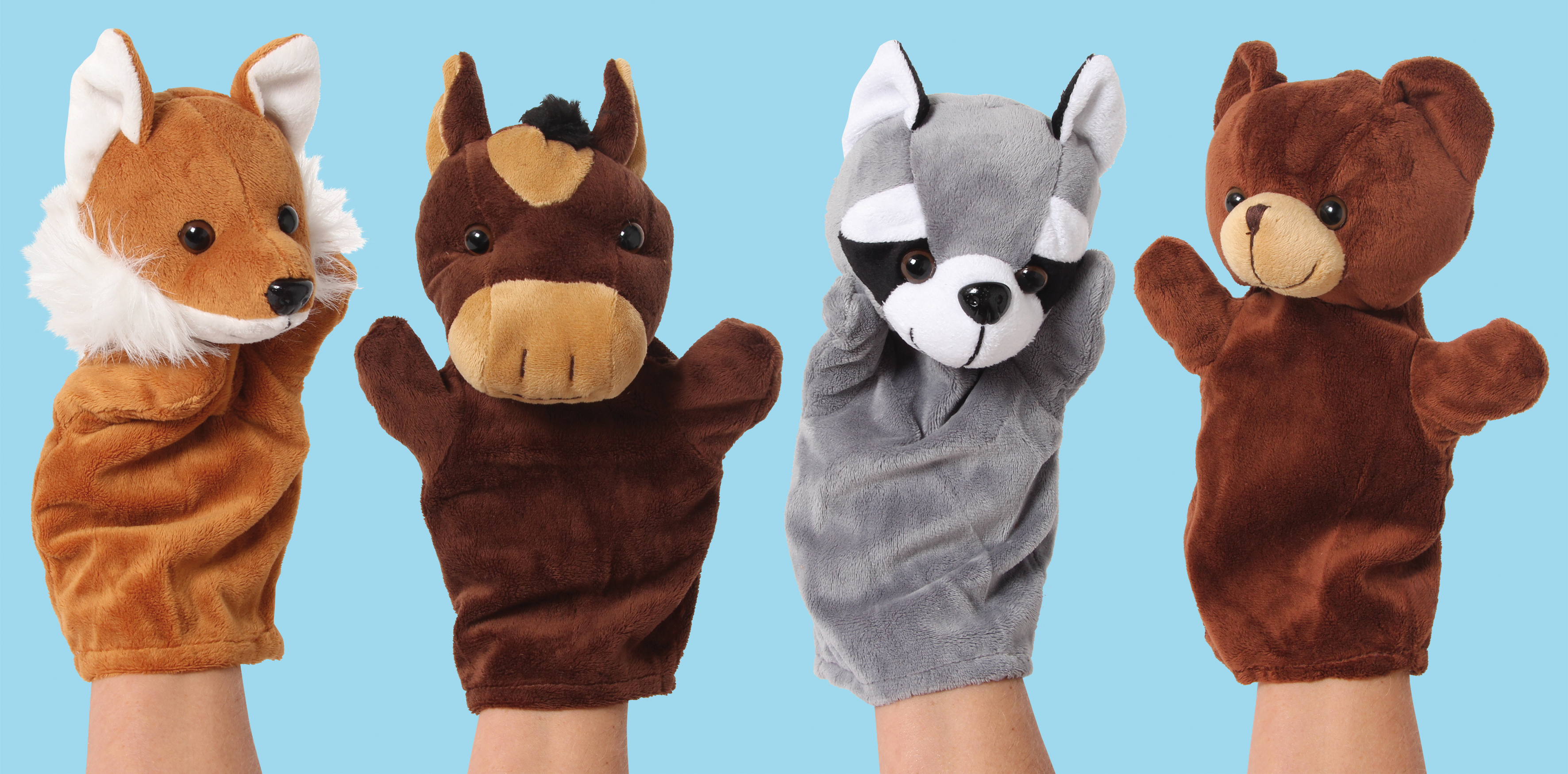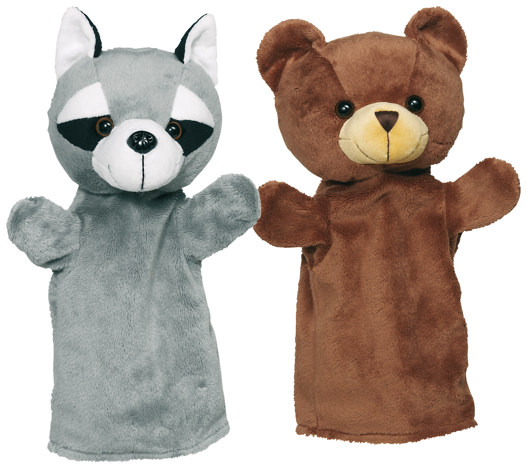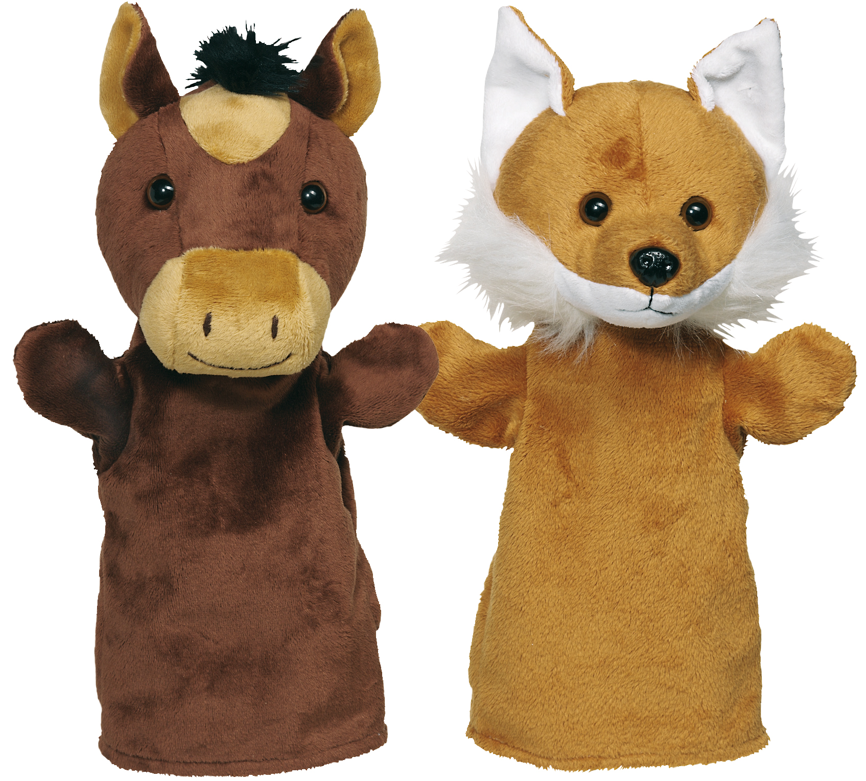 Niedliche Schmuse-Handpuppen zum Spielen und Liebhaben. Vier Motive im Set: Pferd, Fuchs, Waschbär und Bär.