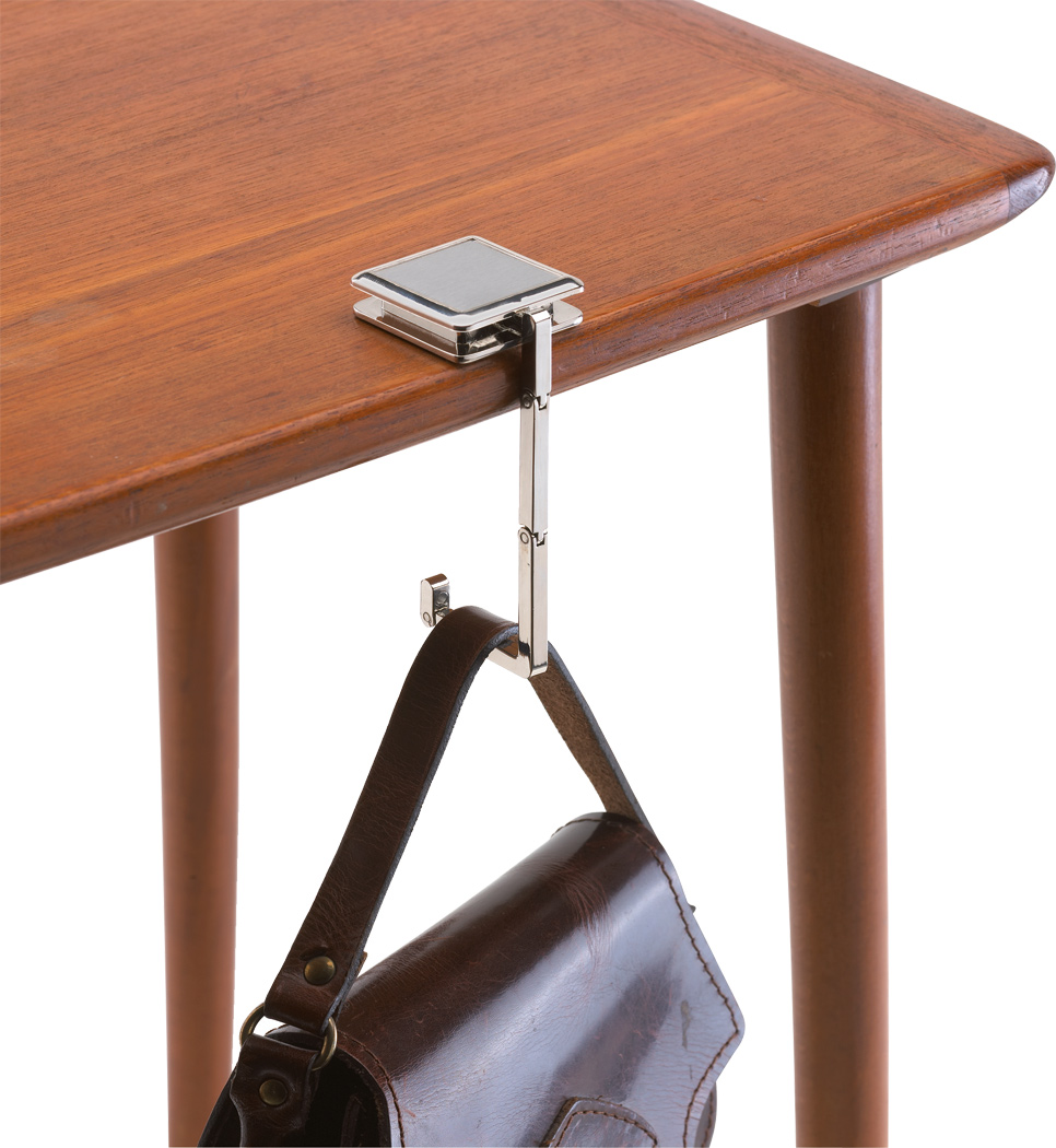Handtaschen-Halter MONTREUX, ausklappbar: Oberseite aus Edelstahl für Werbeanbringung, gummierte Unterseite sorgt für sicheren Halt auf glatten Oberflächen