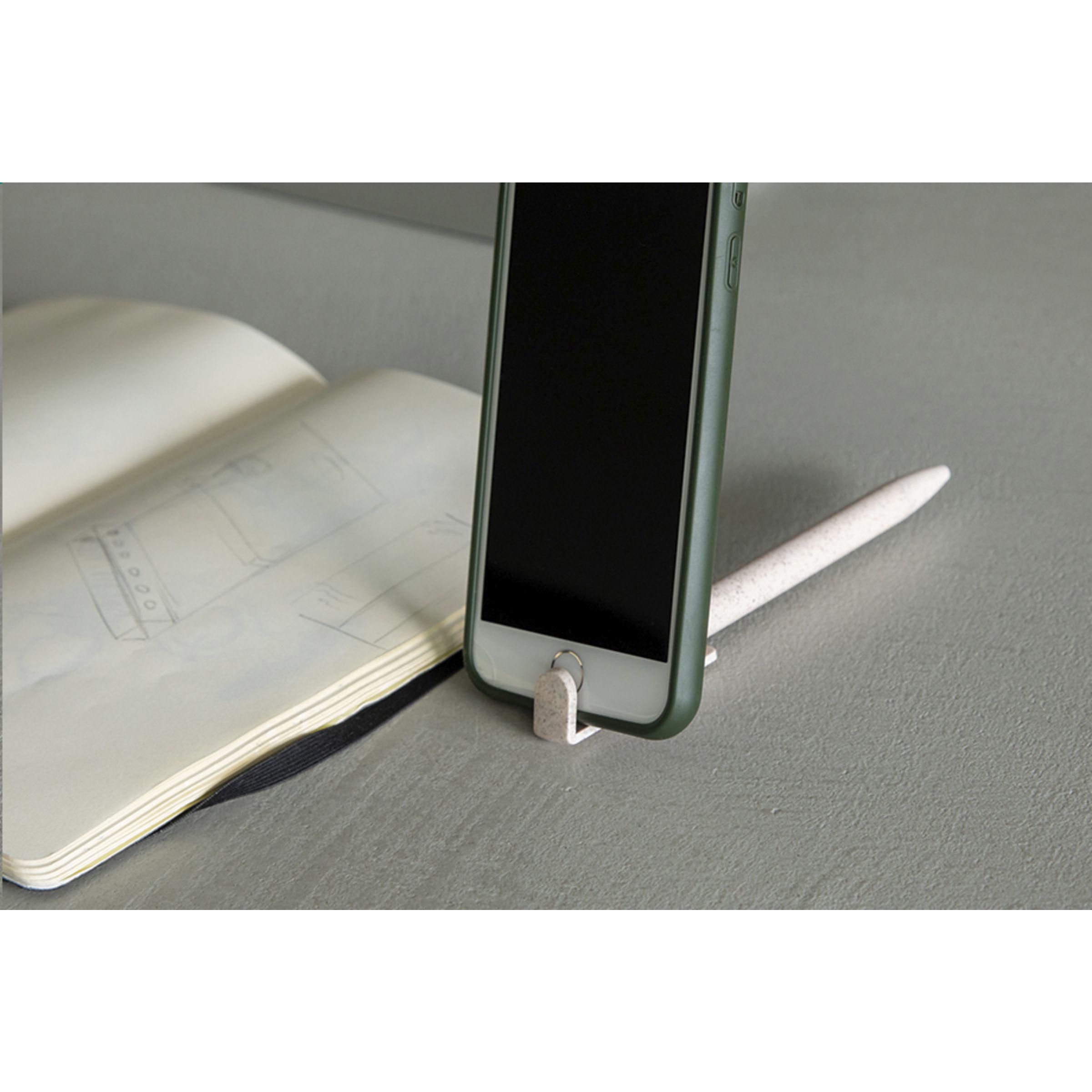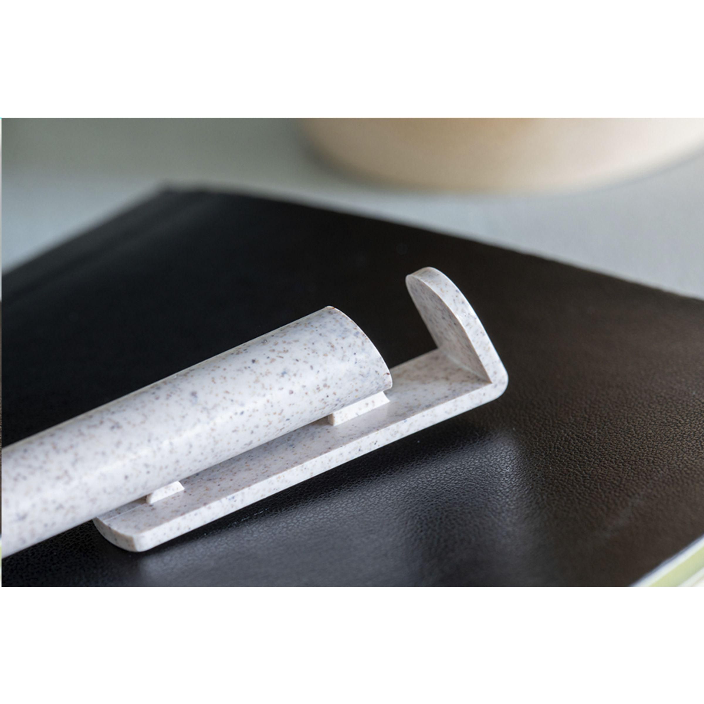 Beschreibung: Blauschreibender Kugelschreiber aus 80% Weizenabfällen und 20% Kunststoff. Weizen wird auf der ganzen Welt angebaut. Dies bedeutet, dass auch eine große Menge Weizenabfälle in Form von Blättern, Stroh und mehr anfallen. Aus diesem Abfall wird dieser Stift hergestellt. Dieser Stift hat ein nettes Extra: Er ist auch ein Telefonhalter.