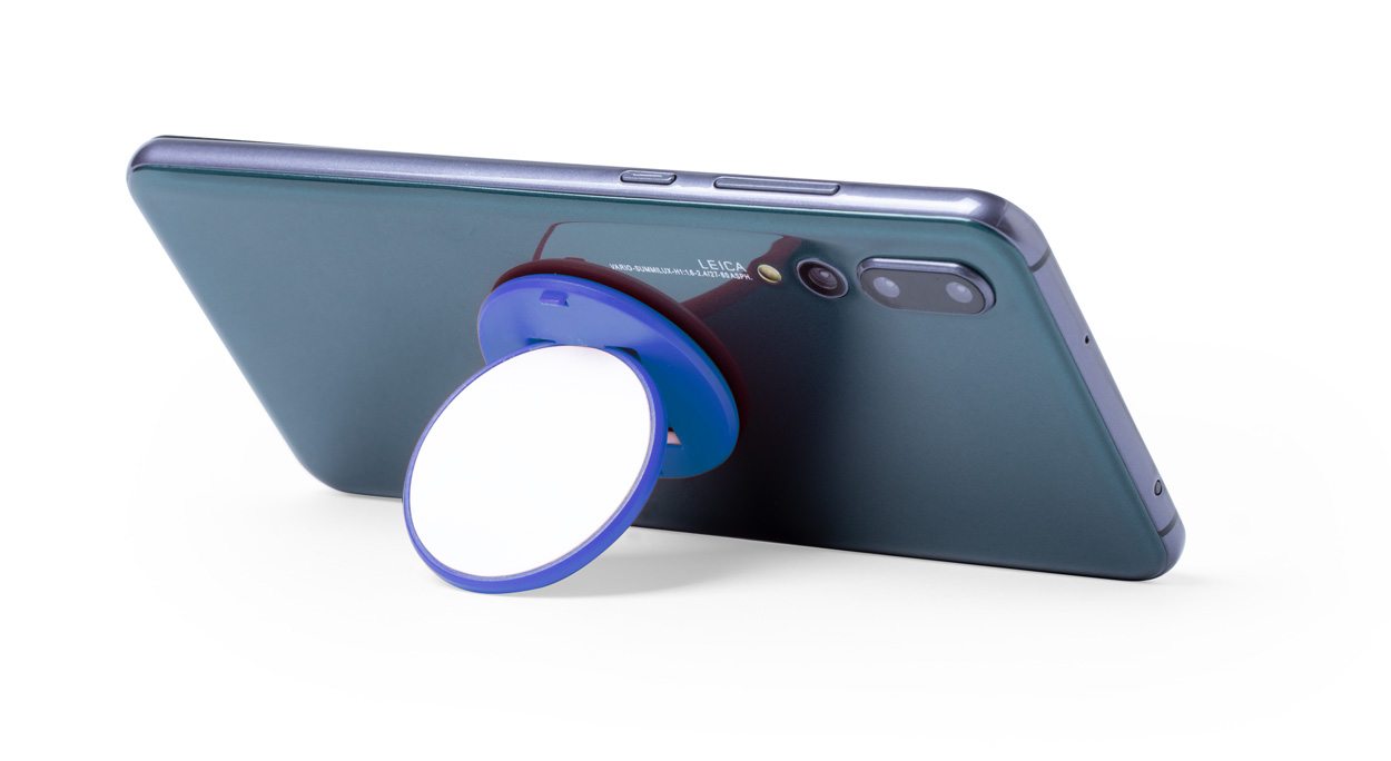Runder Handyhalter aus Kunststoff mit selbstklebender Rückseite.