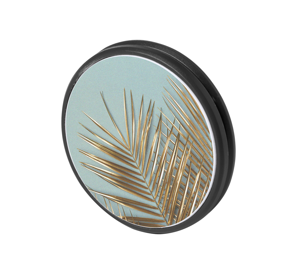 Runder Handyhalter aus Kunststoff mit selbstklebender Rückseite.
