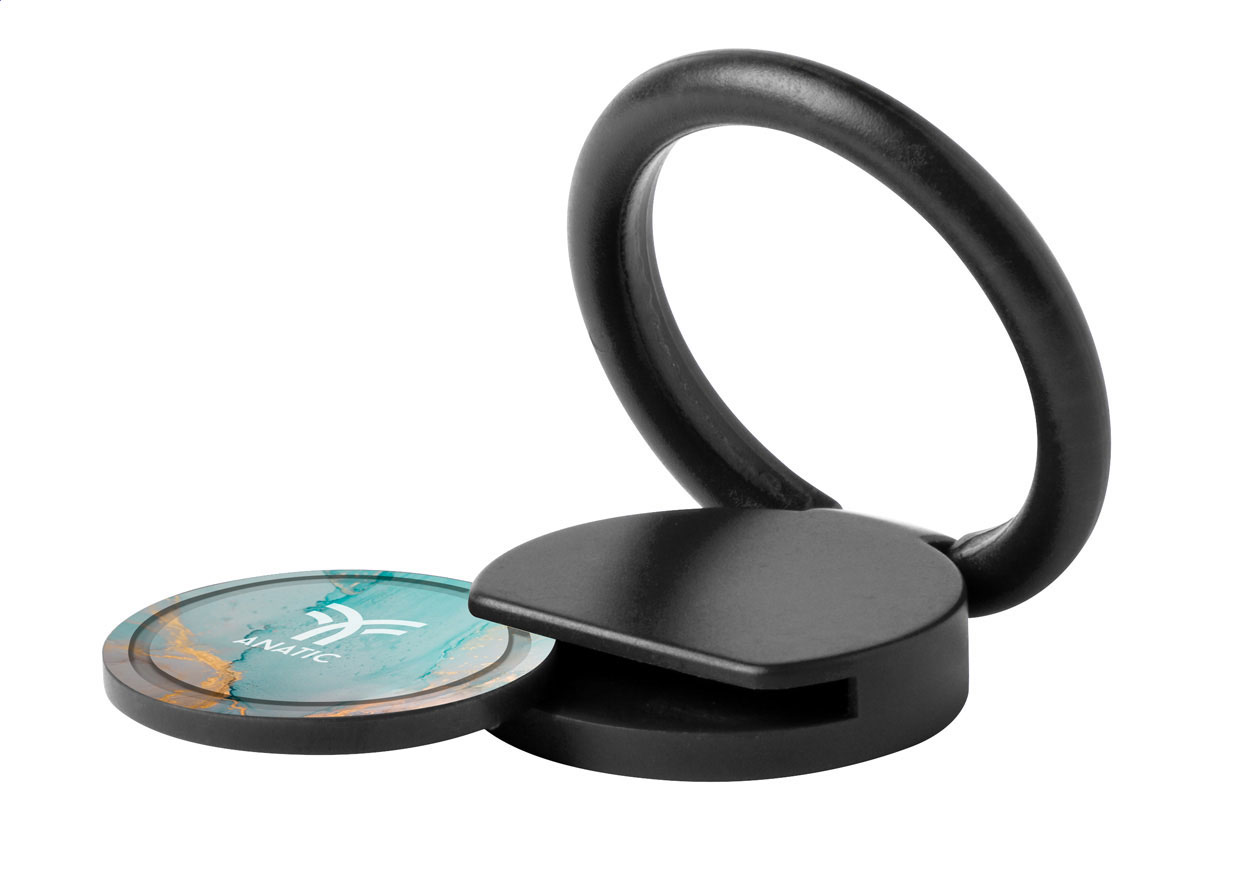 Runder Handyhalter aus Kunststoff mit selbstklebender Rückseite und Einkaufswagen-Chip.