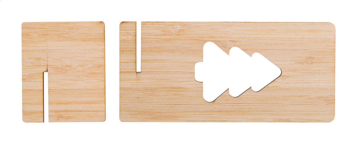 Tisch-Handyhalter aus Bambussperrholz mit gestanztem Weihnachtsmotiv. Die Lieferung erfolgt flach verpackt.
