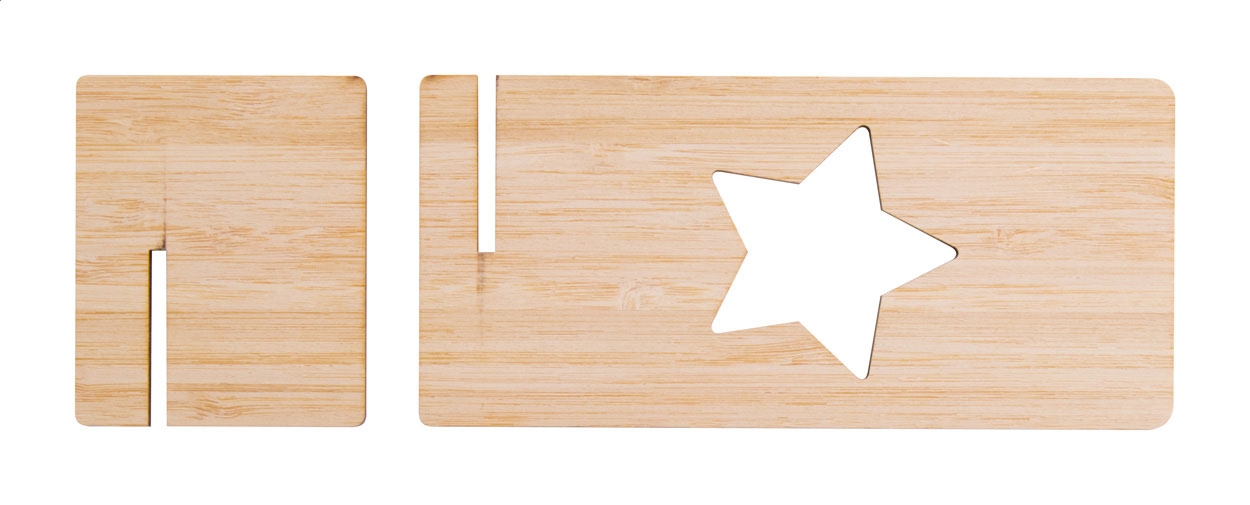 Tisch-Handyhalter aus Bambussperrholz mit gestanztem Weihnachtsmotiv. Die Lieferung erfolgt flach verpackt.
