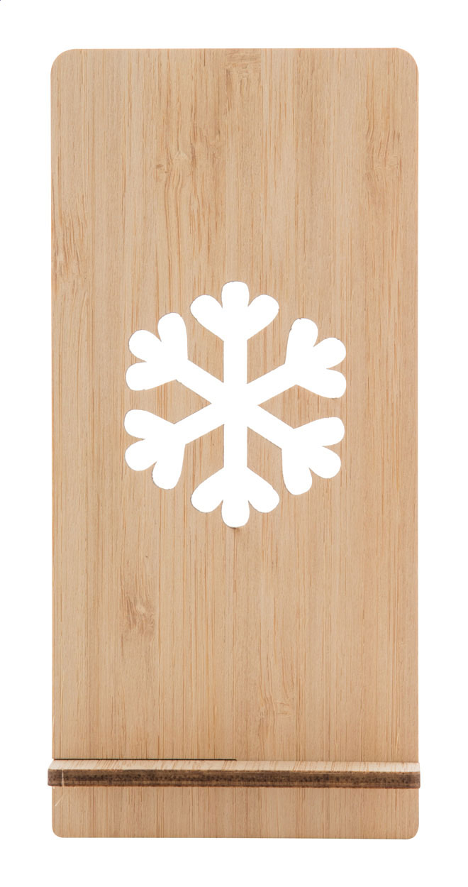 Tisch-Handyhalter aus Bambussperrholz mit gestanztem Weihnachtsmotiv. Die Lieferung erfolgt flach verpackt.