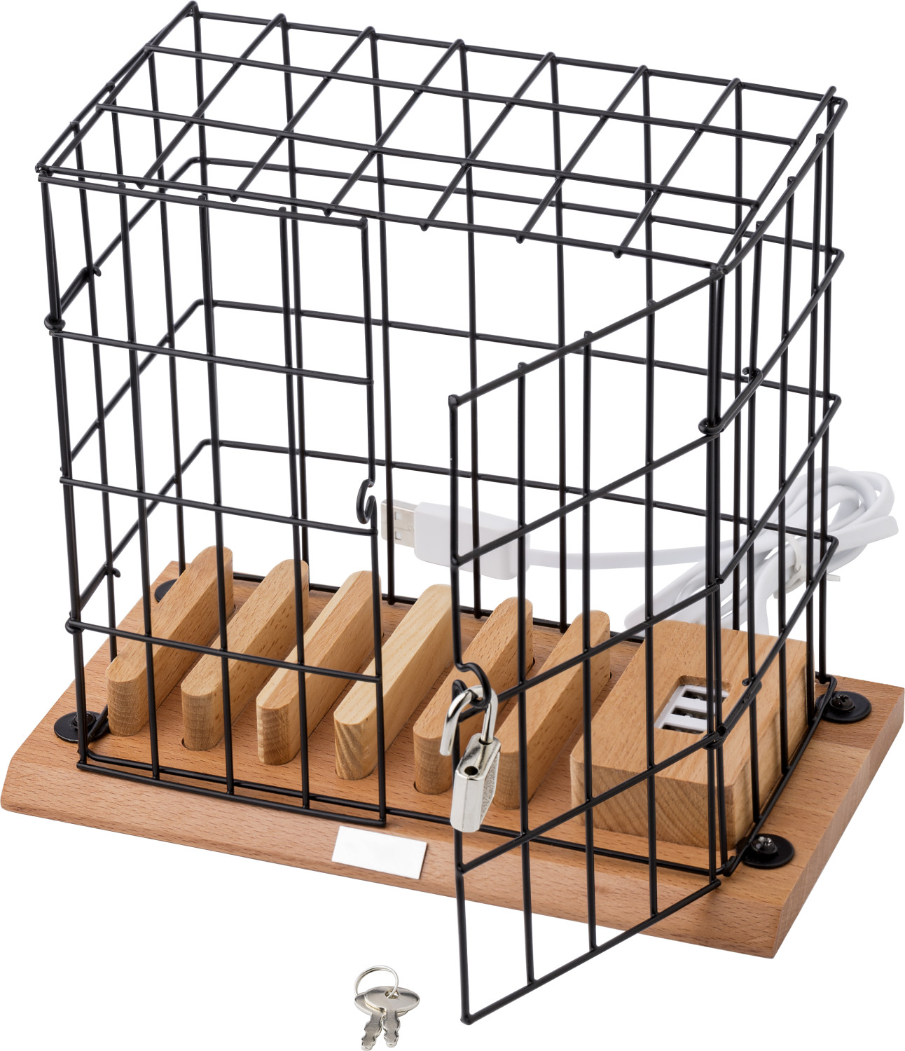 Handyhalter-Käfig aus Aluminium und Holz mit USB-Port und einem Schloss mit zwei kleinen Schlüsseln.