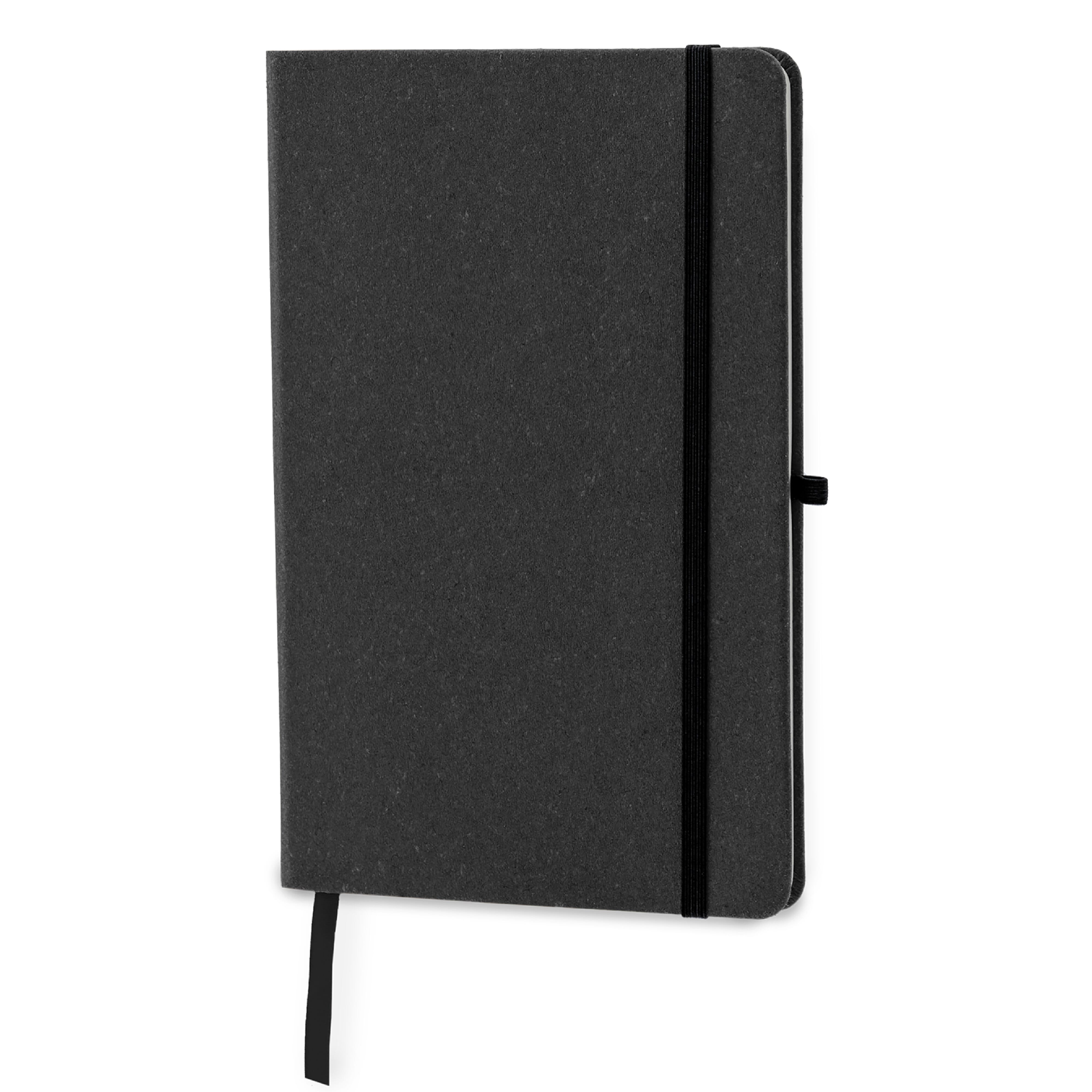 Stilvolles Hardcover-Notizbuch im Ledereinband. Der Bezug besteht aus recyceltem Leder und ist strapazierfähig. Das Notizbuch enthält 160 cremefarbene Seiten und ein Lesezeichen. Es kann mit einem Gummiband geschlossen werden und hat eine Schlaufe für einen Stift.