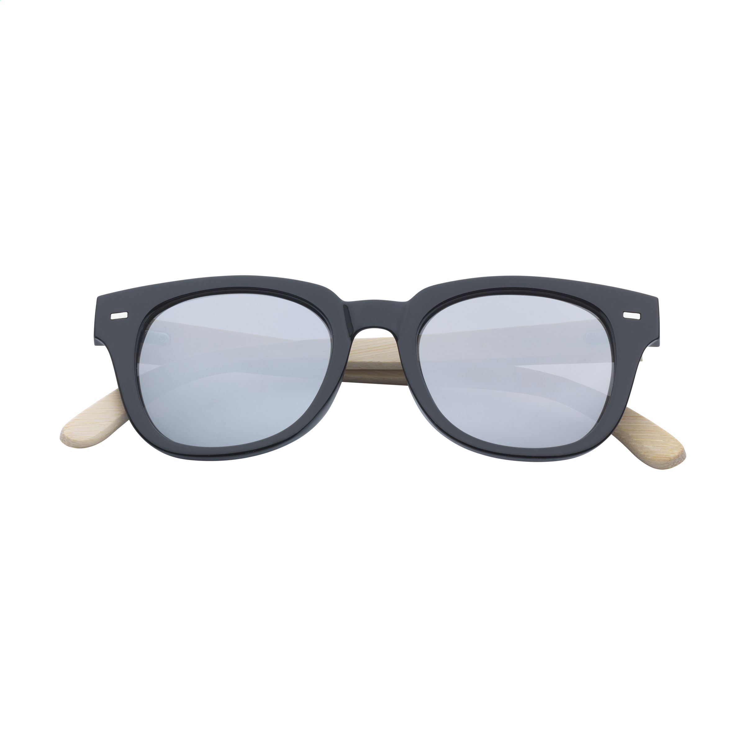 Auffallende Sonnenbrille mit verspiegelten Gläsern. Das Gestell dieses klassischen Modells besteht aus robustem Kunststoff und die Bügel sind aus Bambus gefertigt. Mit 400 UV-Schutz (nach europäischen Standards). Wird einzeln in einem Kraftkarton geliefert.