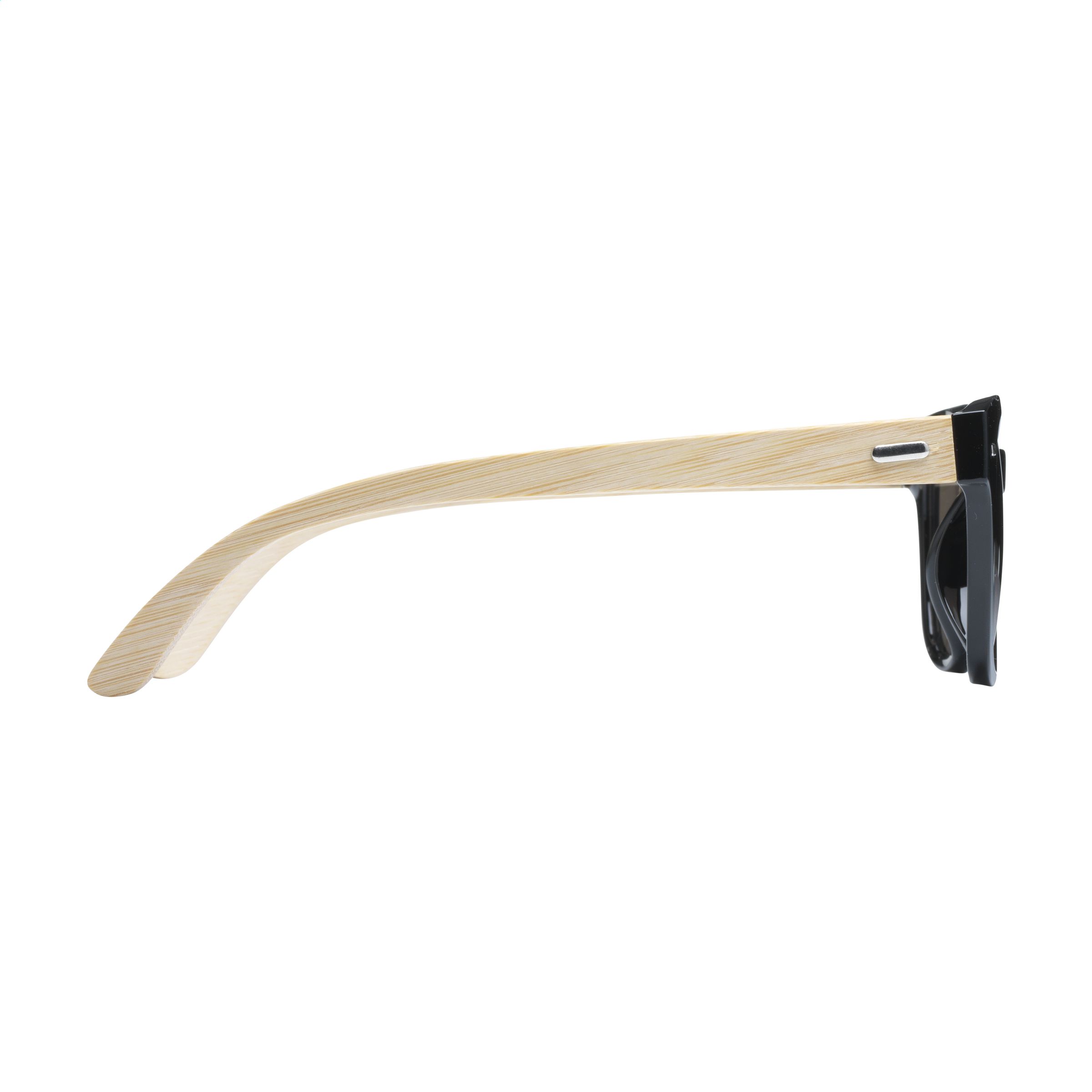 Auffallende Sonnenbrille mit verspiegelten Gläsern. Das Gestell dieses klassischen Modells besteht aus robustem Kunststoff und die Bügel sind aus Bambus gefertigt. Mit 400 UV-Schutz (nach europäischen Standards). Wird einzeln in einem Kraftkarton geliefert.