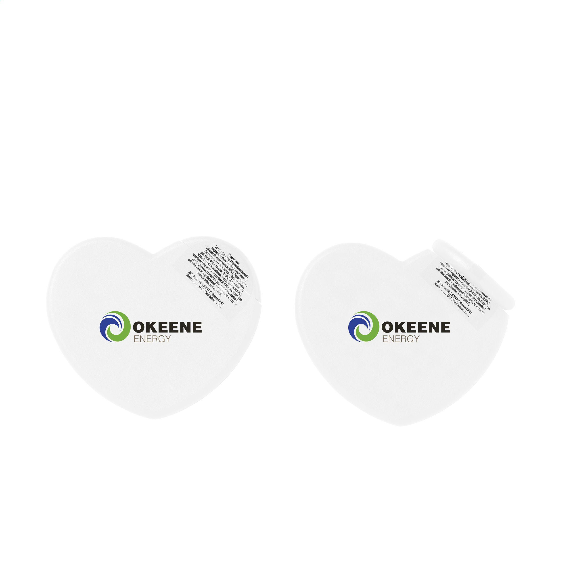 Ein kompakter und flacher herzförmiger Spender aus Kunststoff, gefüllt mit ca. 8 Gramm (50 Stück) zuckerfreien Pfefferminzdrops.