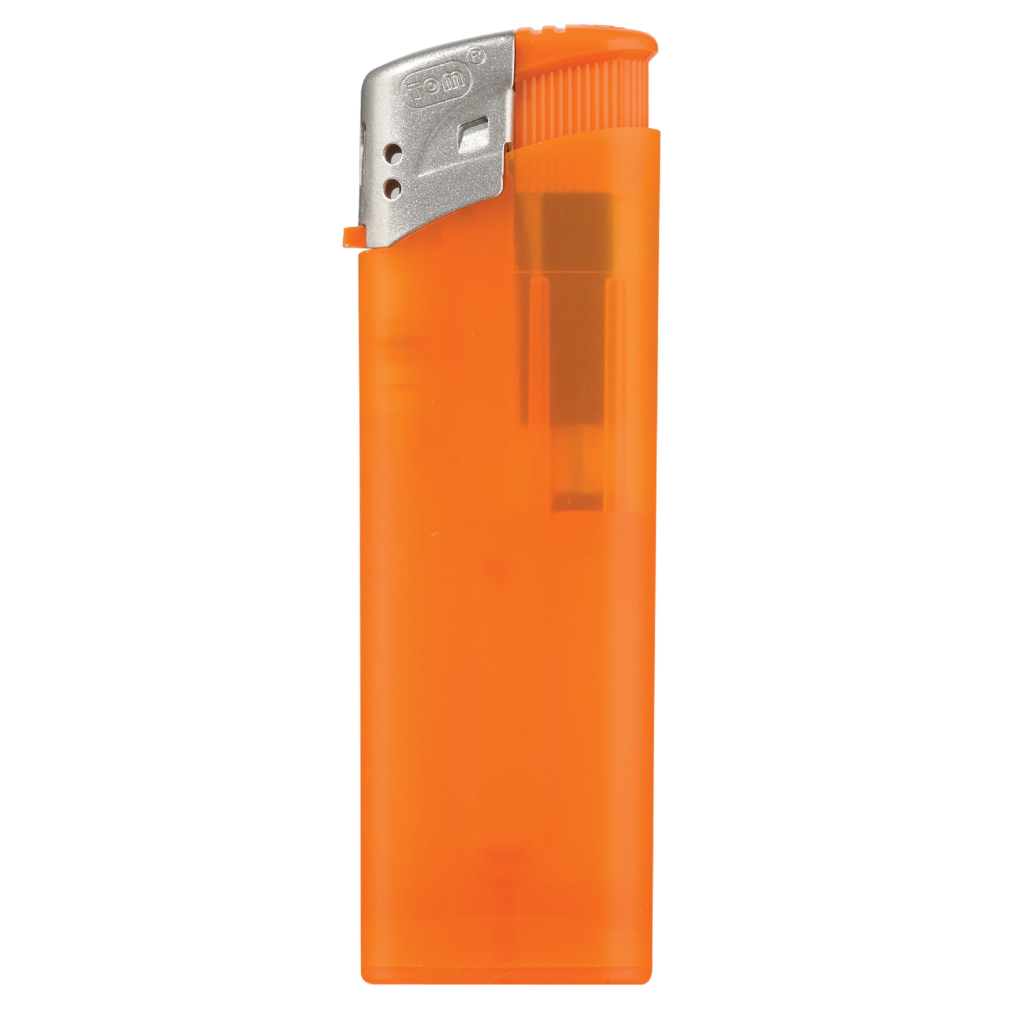 Elektronisches, nachfüllbares Feuerzeug in gefrosteten Farben mit matt silberner Kappe. Mit Kindersicherung.