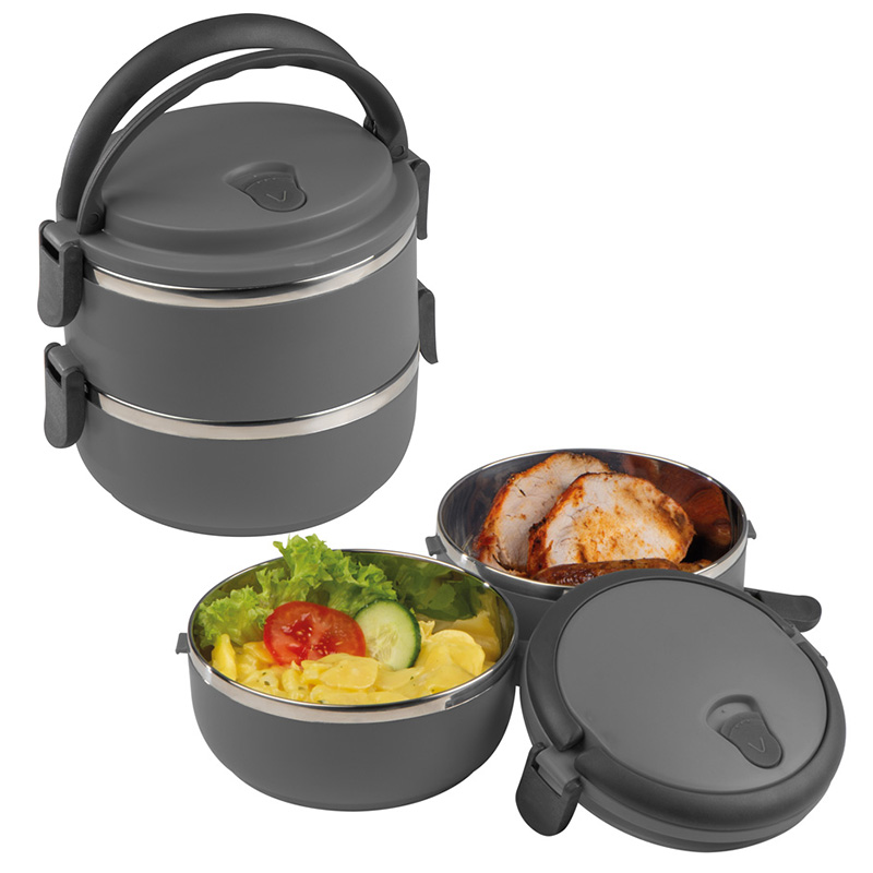 Perfekt zum Lunch, Henkelmann mit zwei Warmhaltekammern aus Edelstahl und Kunststoff mit Tragebügel. Ihre Werbung drucken wir auf den Deckel.