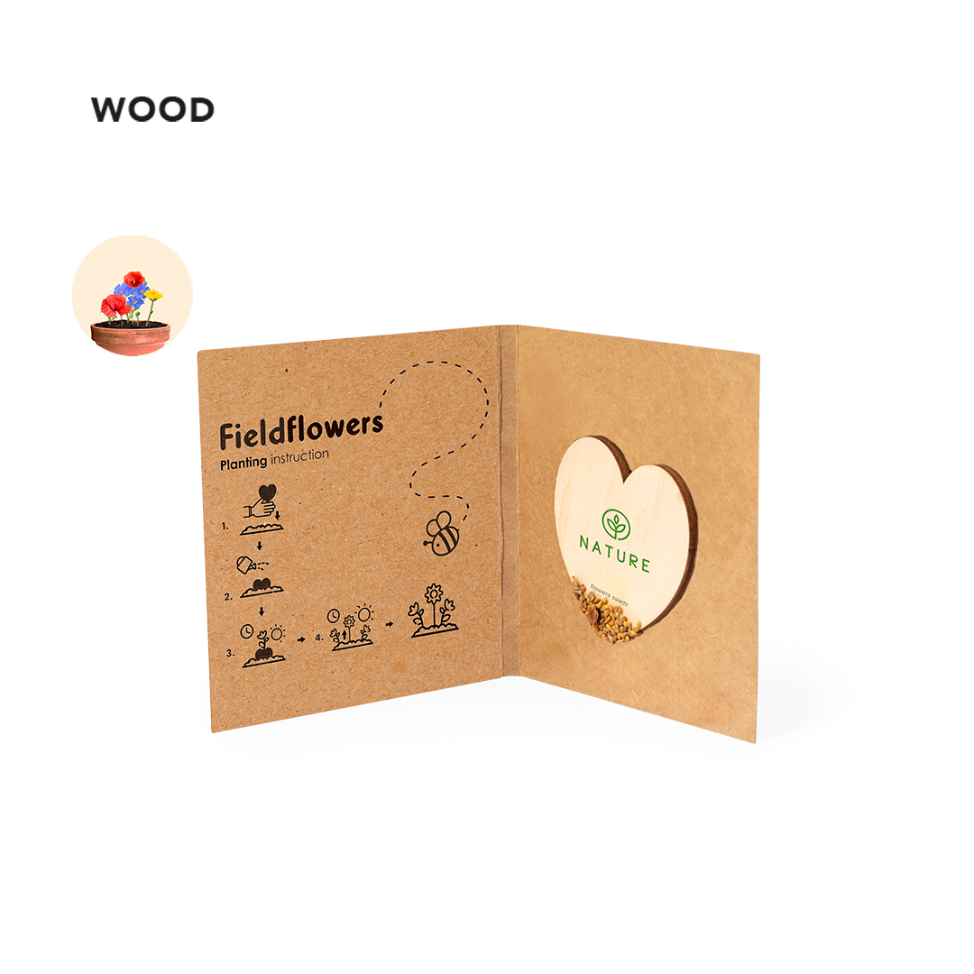 Samenherz aus natürlichem Holz, mit Wildblumensamen, bereit zum Einpflanzen. Präsentiert in einer eleganten Karte aus recyceltem Karton, mit Pflanzanleitung und großer Beschriftungsfläche.