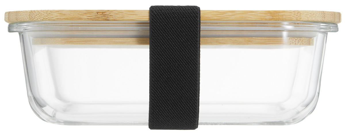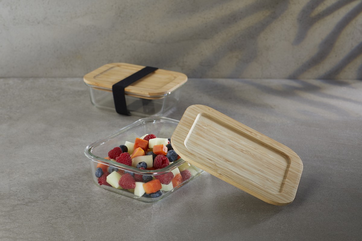 Da freut man sich schon auf den Snack, bevor man den DeckeldesGlasbehälters lüftet! Die stapelbare Lunchbox aus hitzebeständigem Borosilikatglas macht im Büro als Brotdose oder im Kühlschrank als Frischhaltedose gleichermaßen eine gute Figur! Auch in der Größe L erhältlich. Nachhaltige Aufbewahrungsbox für Lebensmittel. Volumen 640 ml. Hochtemperaturbeständiges Borosilikatglas (bis 560°C), Naturbelassener Bambusdeckel mit Silikonlippe. Schwarzes Halteband. Material: Glas, Bambus, Acryl Verpackung: Einzelverpackung Maße: 173 x 127 x 59 mm Gewicht: 576 g Werbeanbringung: Auf Körper 30 x 25 mm (D4), auf Deckel 50 x 30 mm (L4), auf Deckel 70 x 50 mm (L5), Ökologisch, nachhaltig und dieses Produkt unterstützt aktiv den Ausgleich der entstehenden CO2-Emissionen durch zertifizierte Klimaschutzprojekte.